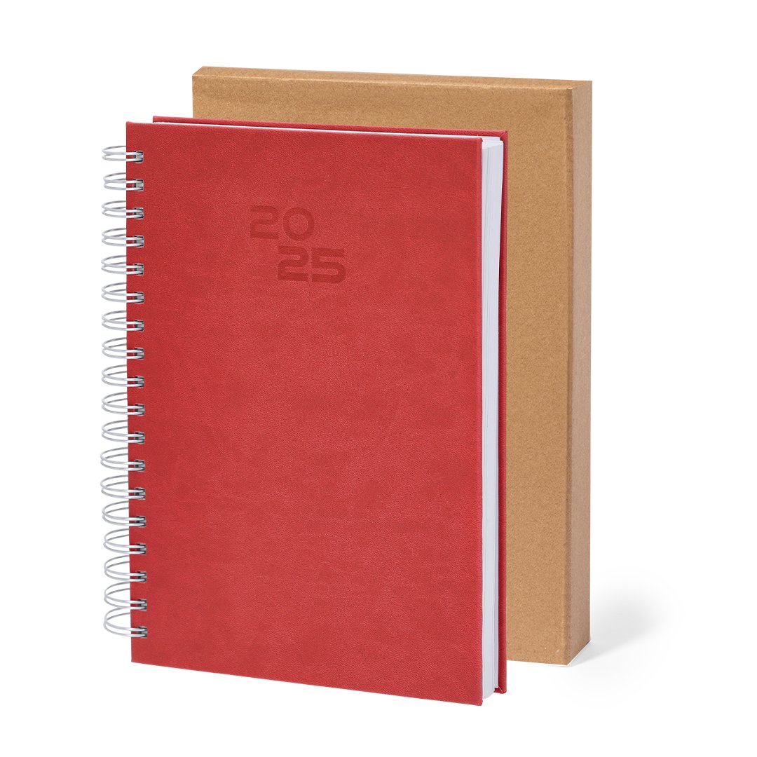 Agenda de anillas tamaño B5, acabada en resistente y suave PU. Con cubiertas rígidas. Incluye caja kraft de presentación.Diseño página día y páginas con esquina troquelada para marcar el día. En 2 idiomas: castellano e inglés.