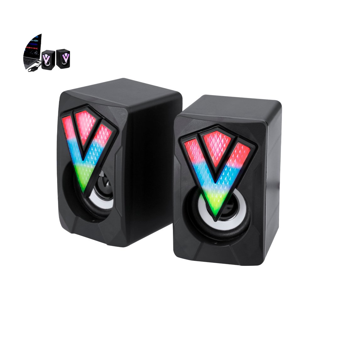 Altavoces gamer diseñados para una experiencia de juego inmersiva. Diseñados con carcasa en negro mate con luces LEDs multicolor y efectos de iluminación automáticos. Incluyen un cable integrado con regulador de volumen, conexión jack de 3,5 mm y alimentación a través de USB.