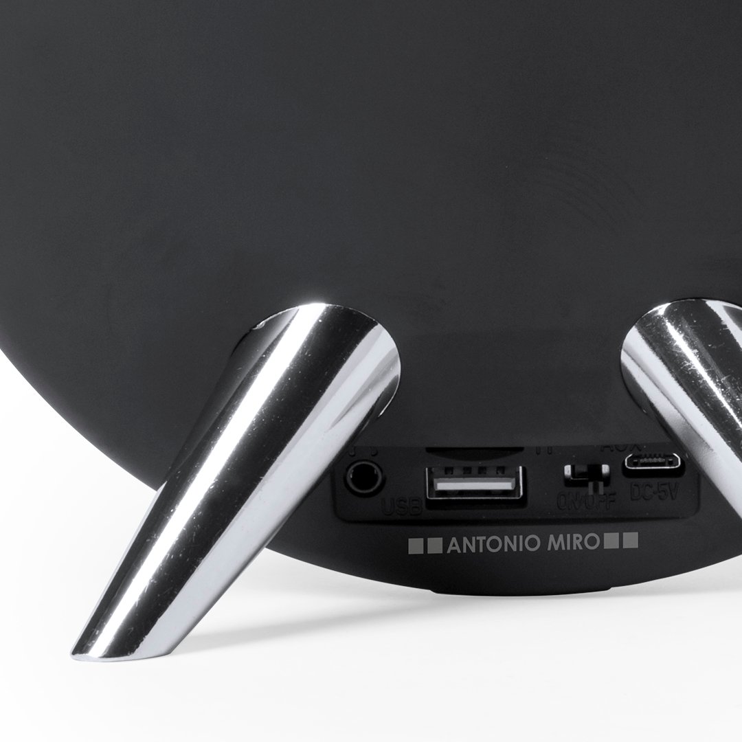 Altavoz de conexión Bluetooth en elegante acabado de color negro con accesorioss en plateado y original diseño circular. Ofrece 8W de potencia, tiene función de manos libres, una ranura para tarjetas micro SD de hasta 32 GB de capacidad y entrada auxiliar de línea mediante conexión jack de 3,5mm. Compatible con iOS y Android, incluye cable de carga mini USB, cable auxiliar jack de 3,5mm y viene presentado en atractiva caja de diseño. Con soportes de goma antideslizantes en la base.