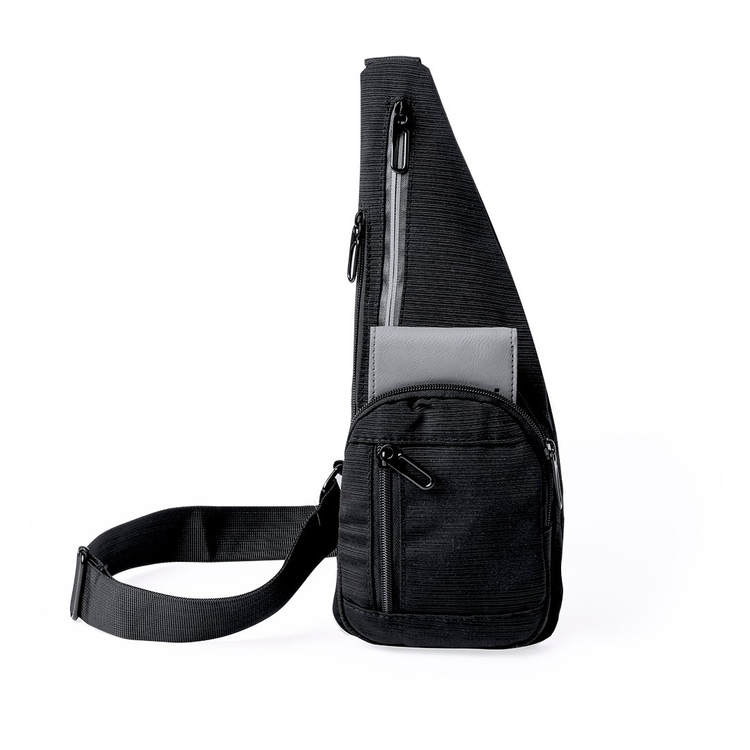 Bandolera confeccionada en poliéster 300D, ofrece múltiples bolsillos para una organización efectiva. Dos bolsillos principales se encuentran en la zona frontal y lateral, junto con dos bolsillos adicionales en la parte frontal y trasera. Destaca por una banda reflectante en el bolsillo central para mejorar la visibilidad. Se presenta de manera individual en una bolsa reciclada.