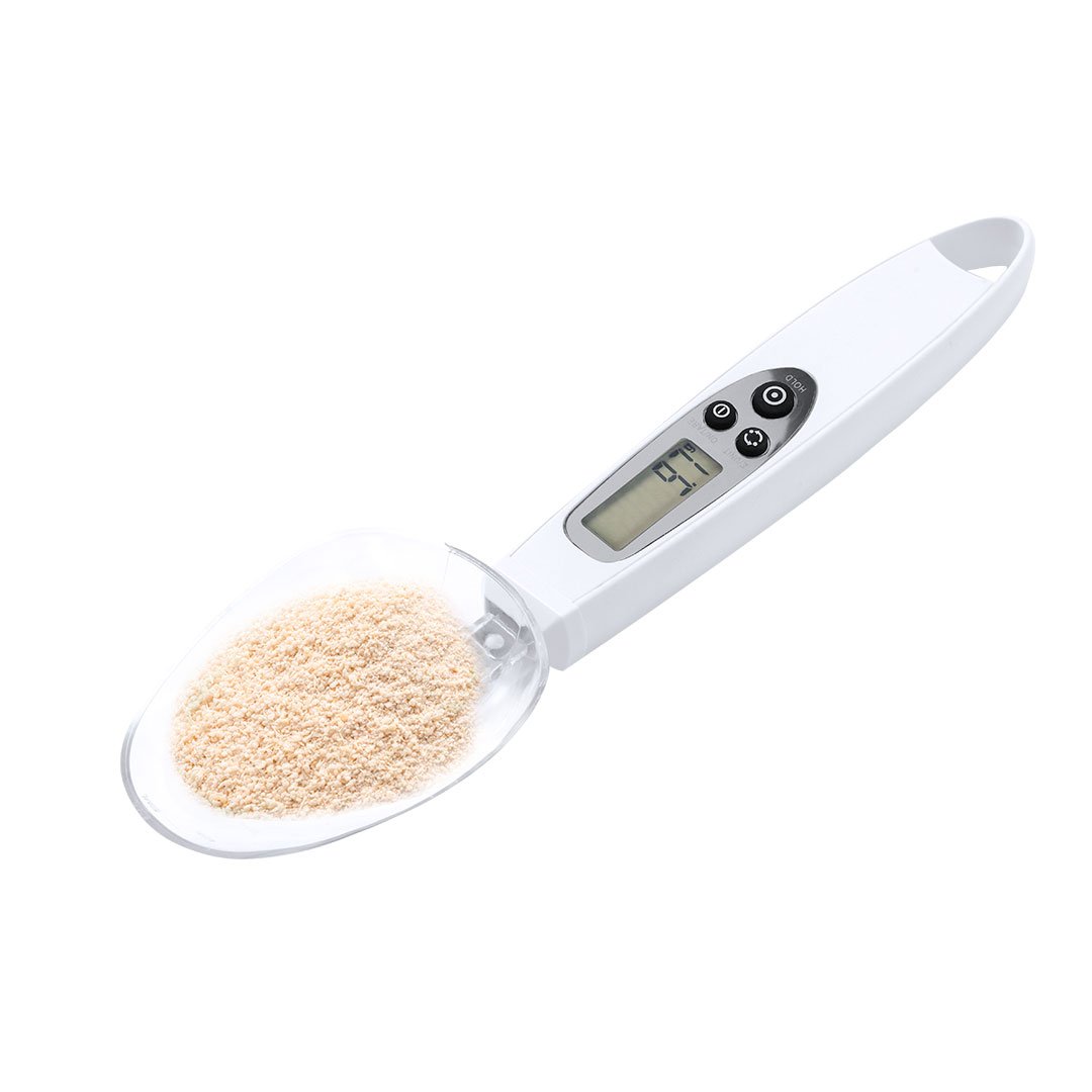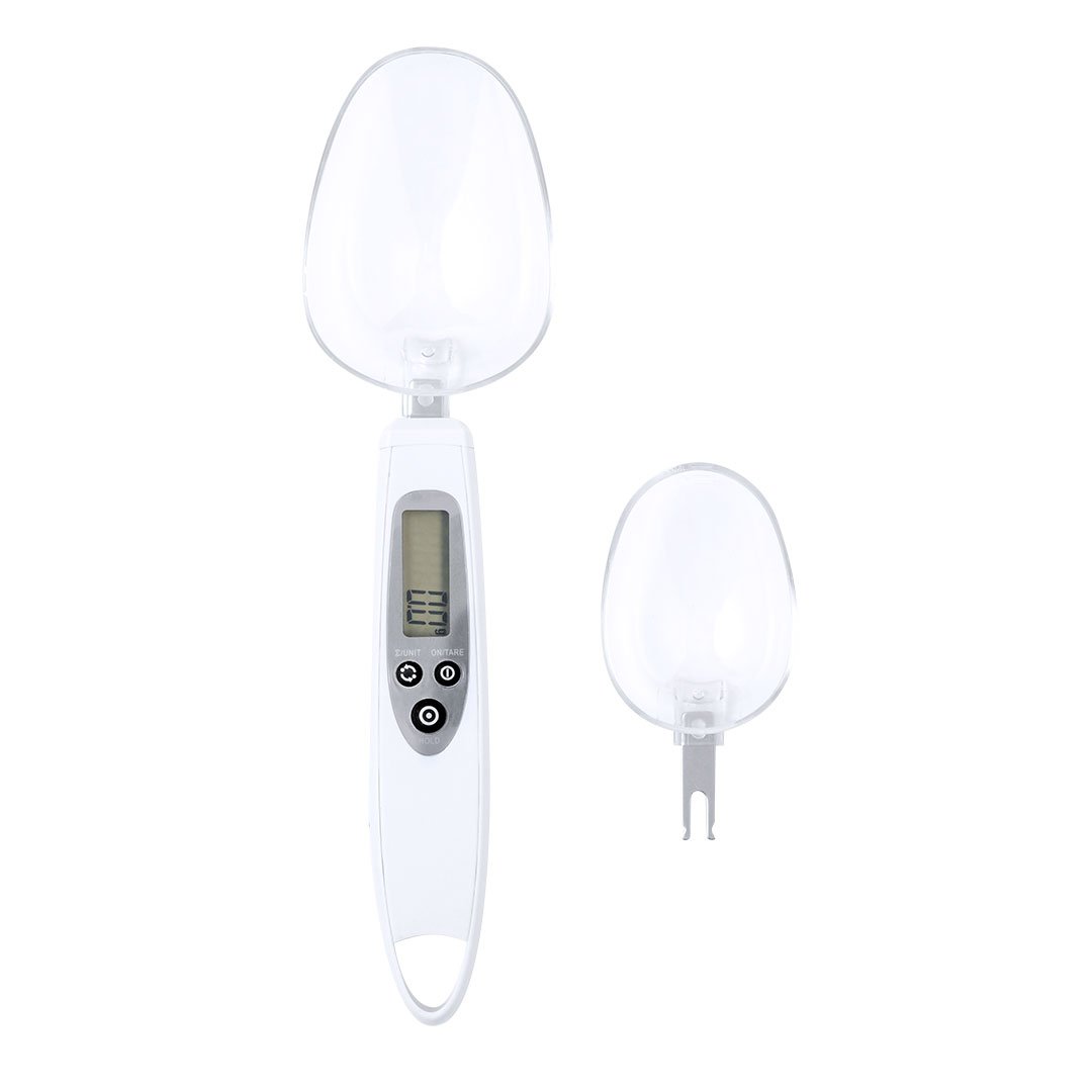 Práctica báscula digital con cuchara, válida para líquidos y sólidos. Incluye 2 cucharas intercambiables y pantalla digital LCD situada en el mango, mostrando el pesaje con una precisión de 0,1g. Botón para mostrar el peso en gramos (g), onzas (oz), o mililitros ( ml), con función de memoria y posibilidad de pesar dos ingredientes. Ambas cucharas llevan grabada una escala de medición adicional para líquidos: la cuchara pequeña desde 5 ml hasta 25 ml; y la cuchara grande desde 10 ml hasta 50 ml. Con manual de instrucciones en español e inglés. Alimentada por pila de botón (incluida) y presentada individualmente en caja de diseño kraft.