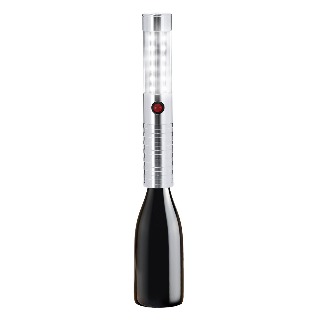 Bastón LED con 3 modos de luz: alta intensidad, media intensidad y luz intermitente. Equipado con 36 LEDs y botón de encendido/apagado. Su tamaño es ideal para acoplar en botellas, destacando en cualquier evento.