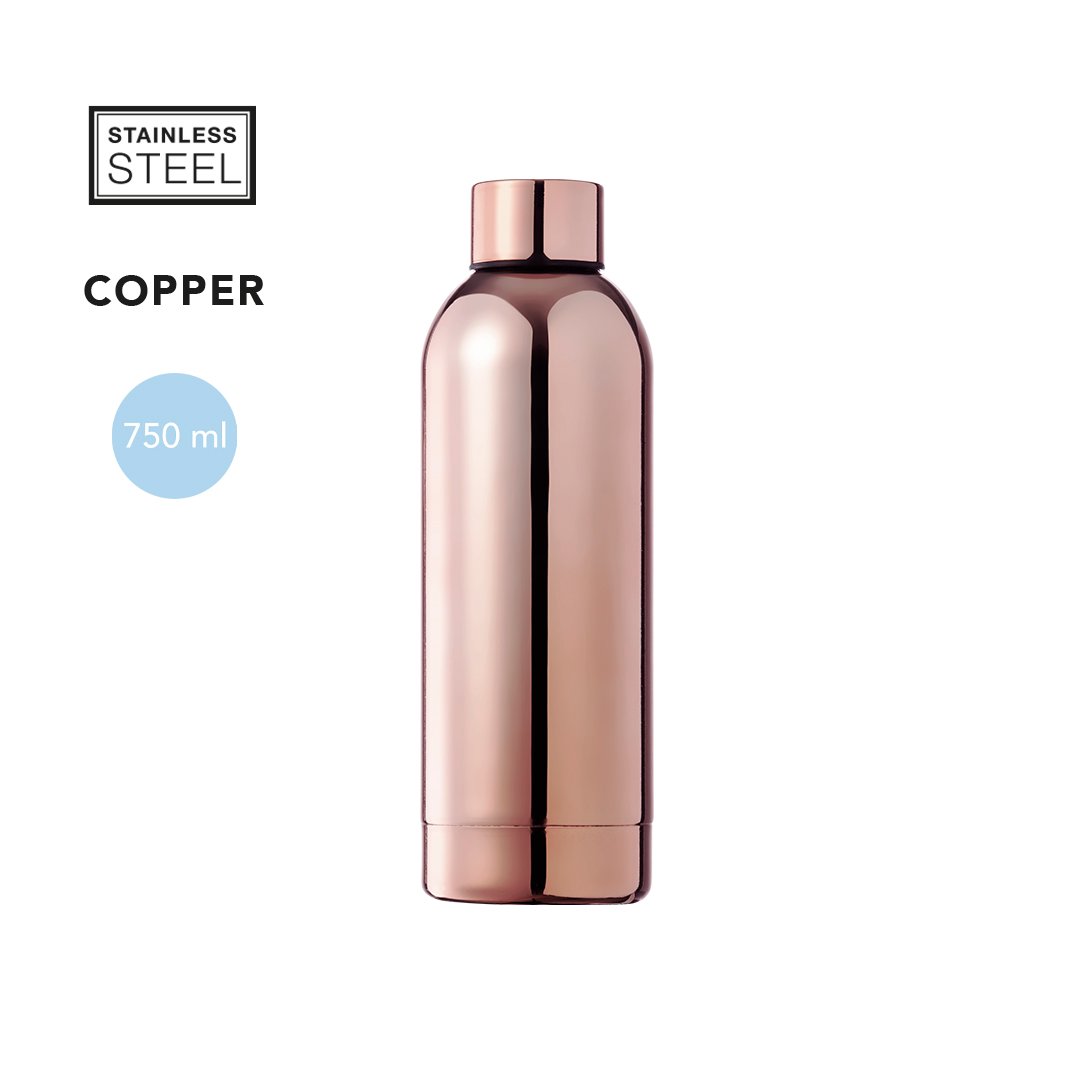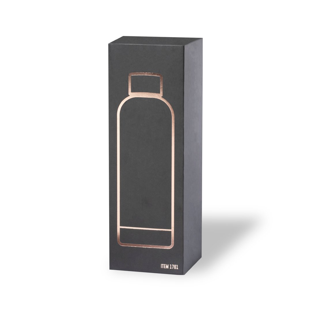 Bidón de 750 ml de capacidad, fabricado en acero inox y con recubrimiento exterior de cobre galvanizado. Tapón a rosca, libre de BPA. Presentado en caja individual negra de elegante diseño.
