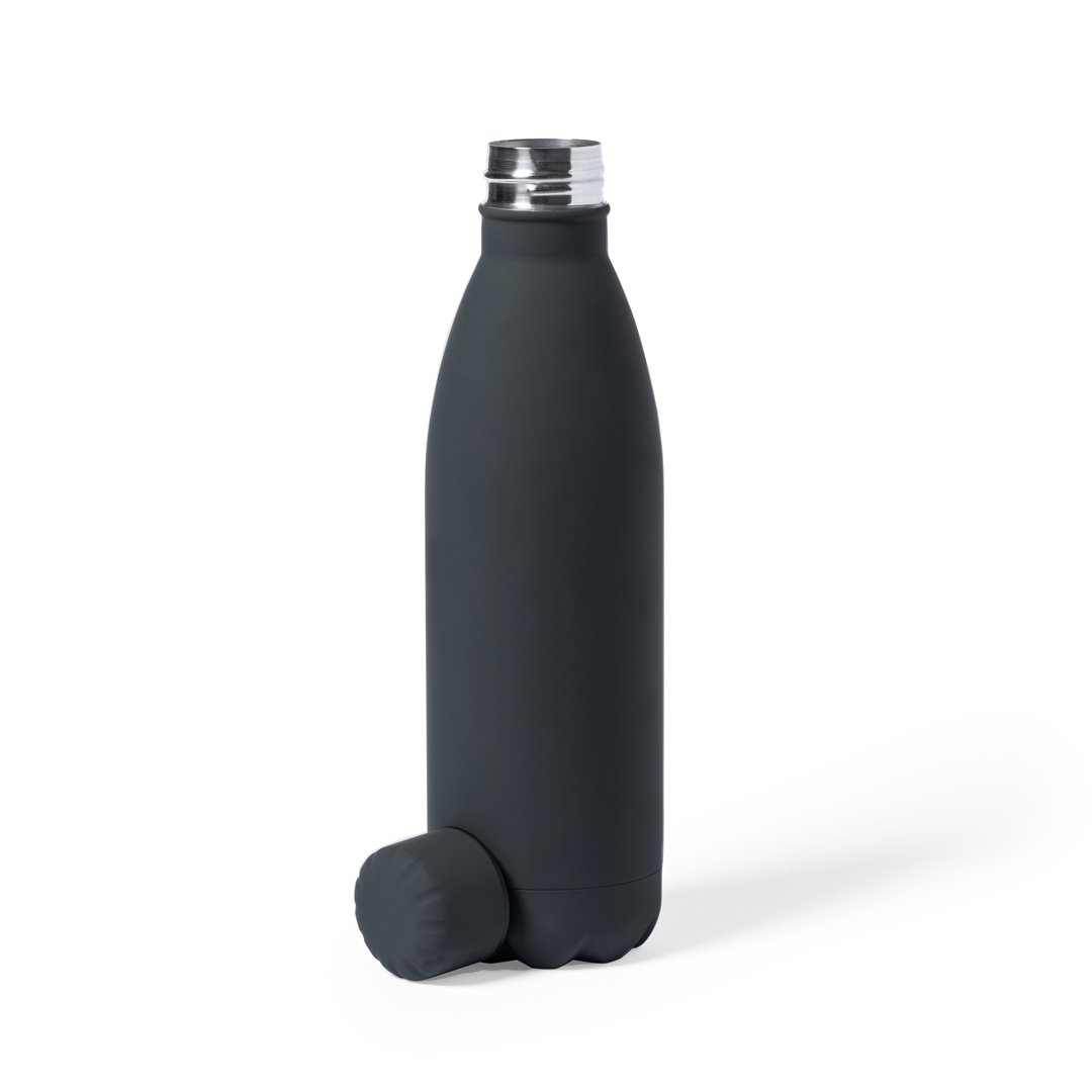 Bidón de 790 ml de capacidad, fabricado en acero inox y acabado con tacto goma, especialmente diseñado para marcaje en láser. Con tapón a rosca a juego, libre de BPA y disponible en variada gama de colores mate. Presentado en caja individual de diseño kraft.Disponible manual de instrucciones en español e inglés.