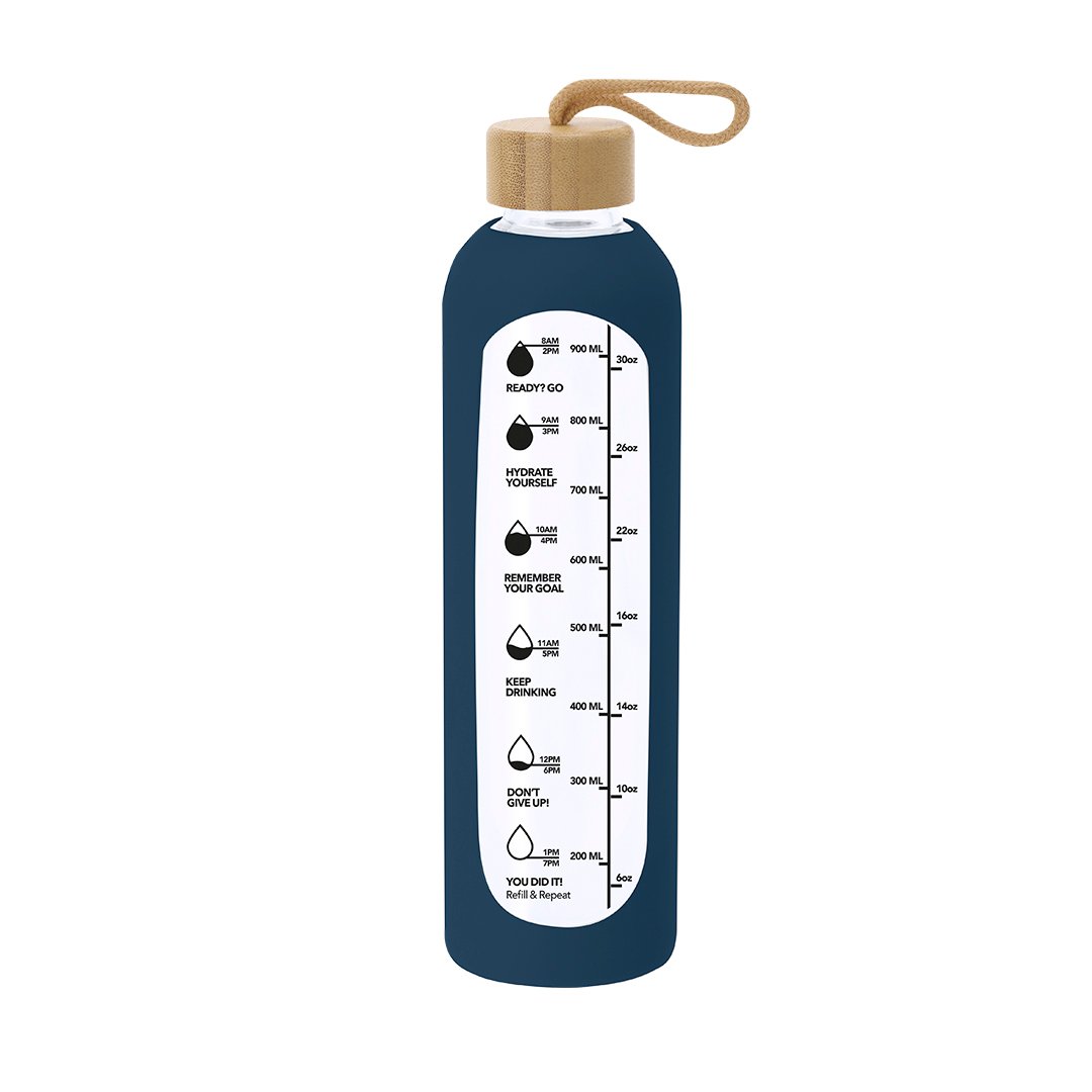 Bidón fabricado en cristal de 1L de capacidad, diseñado para fomentar una hidratación adecuada. Recubierto con funda de silicona que protege y proporciona un agarre cómodo y seguro.Incluye indicador de capacidad en litros y onzas, acompañado de frases motivadoras que inspiran a mantener una correcta hidratación diaria. Tapón, elaborado en bambú, incluye práctico cordón para facilitar su transporte. Libre de BPA.