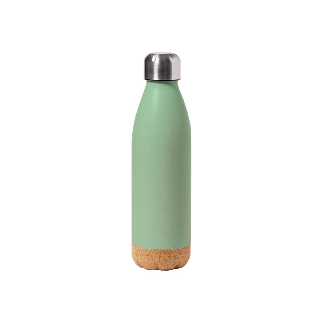 Bidón de 650 ml de capacidad, en combinación de PE veteado con base de corcho natural y tapón en acero inox.Tapón a rosca y libre de BPA. Disponible en variada gama de colores pastel mate y presentado en caja individual de diseño kraft.Certificación Food Grade, garantizando la seguridad cuando los alimentos entran en contacto con el material usado para fabricar el producto.