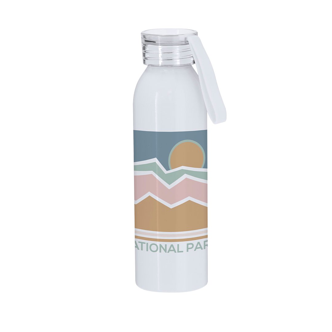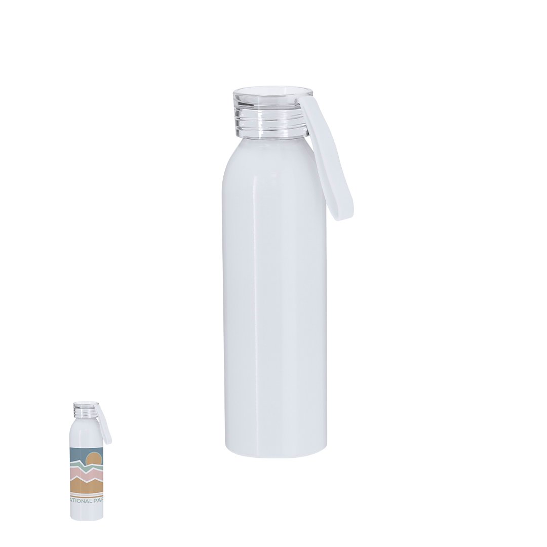 Bidón de 650 ml de capacidad fabricado en resistente aluminio. En color blanco brillante, especialmente diseñado para la sublimación. Con tapón a rosca translúcido y correa a juego para un sencillo transporte. Libre de BPA.