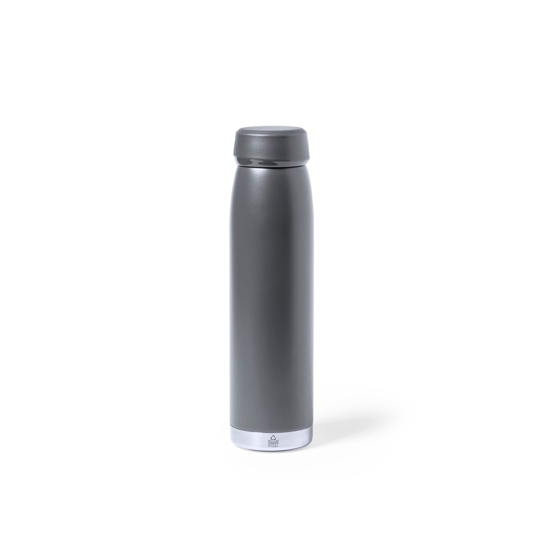 Bidón térmico de 380 ml de capacidad, fabricado en acero inox reciclado de doble pared, con tapón a rosca a juego y base en plata. Disponible en variada gama de colores satinados, libre de BPA y presentado en caja individual de diseño kraft. El acero es uno de los materiales más demandados y que puede encontrarse casi en todas partes, desde productos de uso diario a grandes construcciones. Con innumerables propiedades, entre las que cabe destacar la durabilidad y su alto grado de reutilización, convirtiéndolo en una alternativa muy valorada en soluciones de sostenibilidad. Debidamente tratado, permite obtener nuevos recursos de infinita utilización.