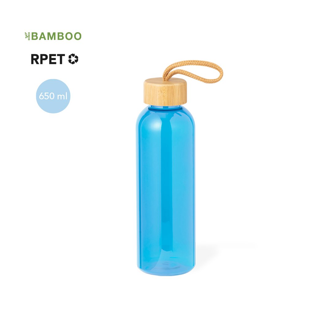 Bidón fabricado en RPET de 650 ml de capacidad, libre de BPA. Tapón a rosca en bambú, con cordón de transporte trenzado. Disponible en variada gama de colores. Presentado individualmente en bolsa de papel.