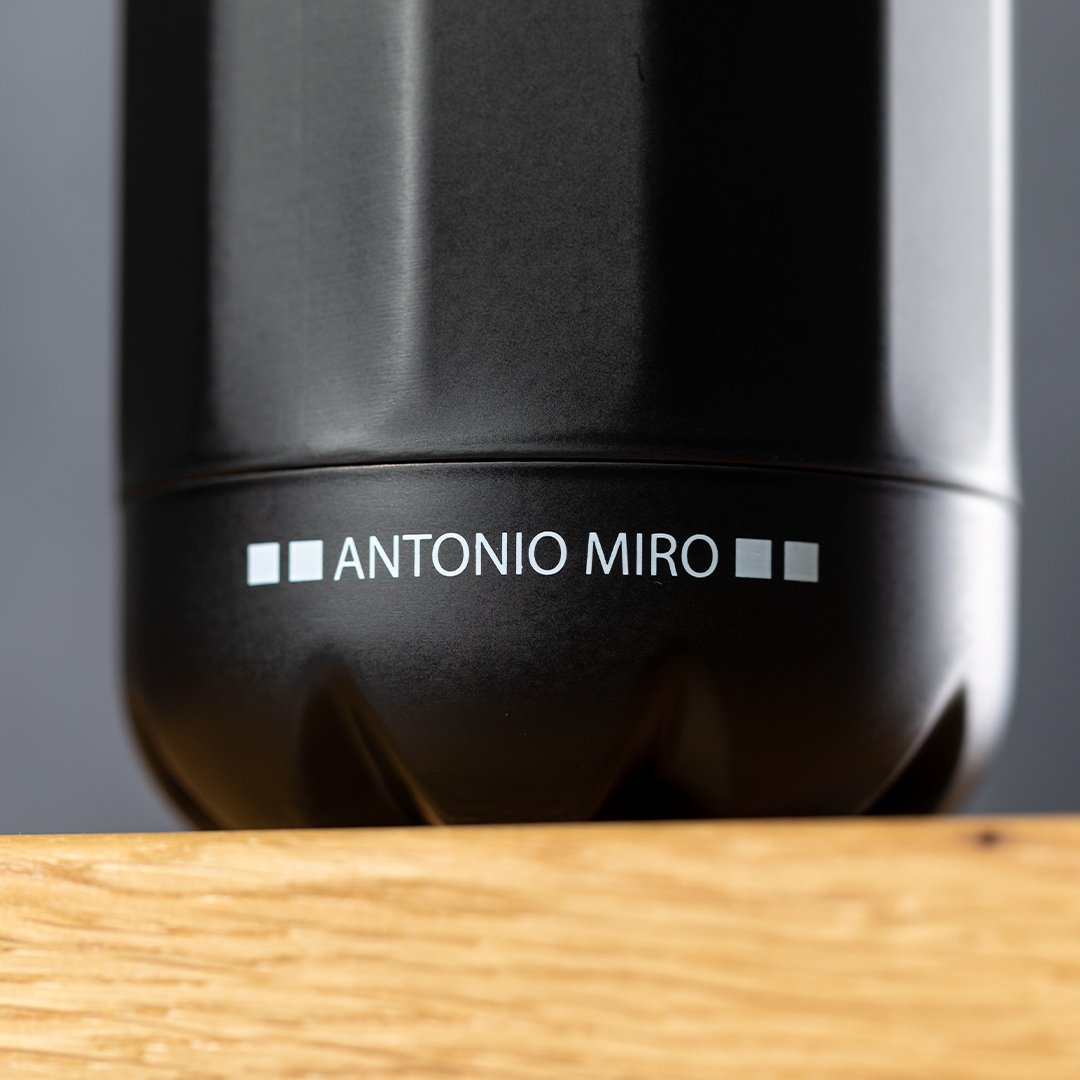 Bidón en acero inox de Antonio Miró. De 750ml de capacidad y sobrio acabado en negro satinado, con cuerpo prisma y logotipo de la marca en la base. Con tapón cromado a rosca y presentado en atractiva caja de diseño con logotipo de la marca.