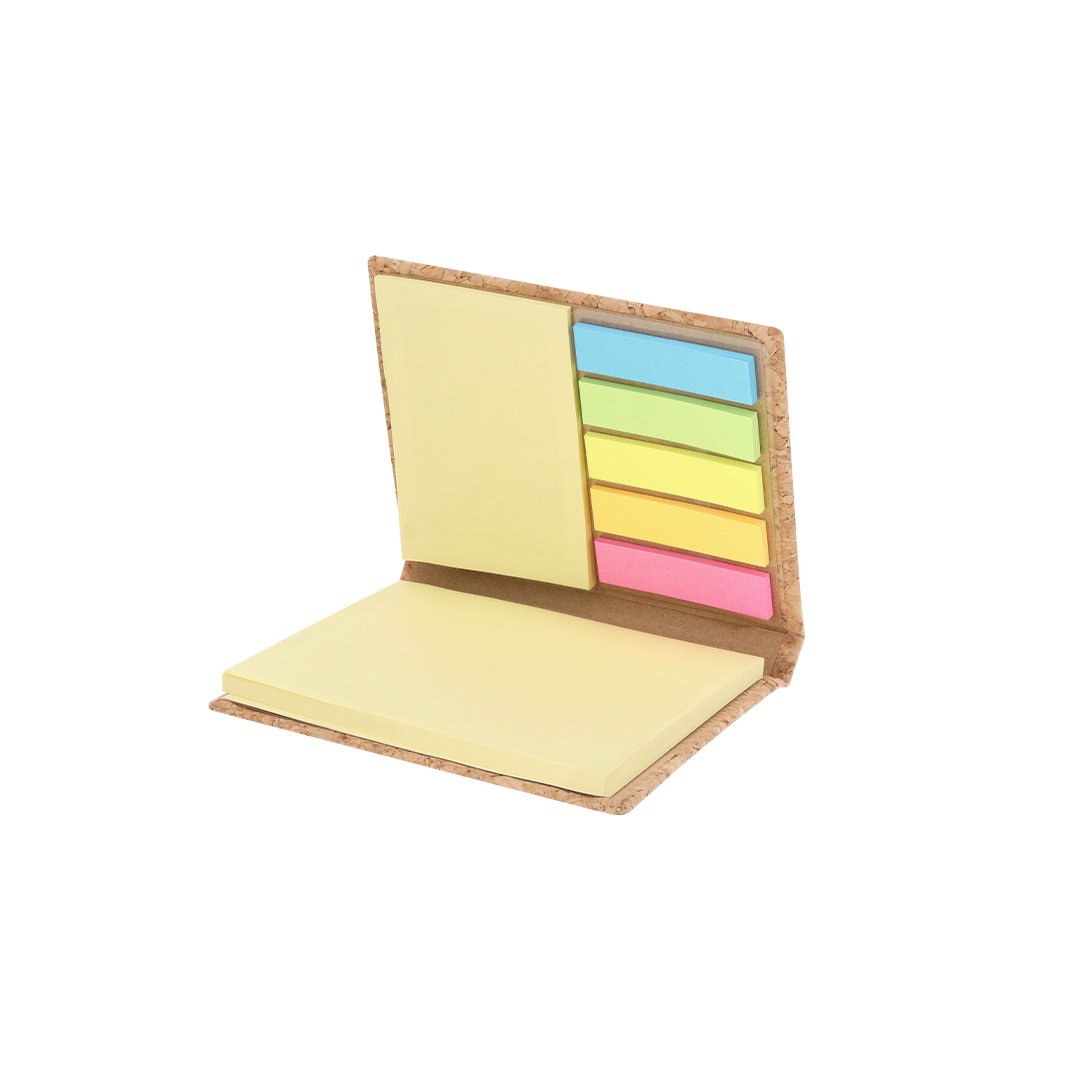 Bloc de notas de corcho con notas adhesivas. Incluye: 50 notas adhesivas tamaño grande, 25 notas adhesivas tamaño mediano y 125 mininotas adhesivas en variados colores.Elaborado con elementos vegetales para así fomentar la utilización de materias primas naturales y reducir las emisiones contaminantes.