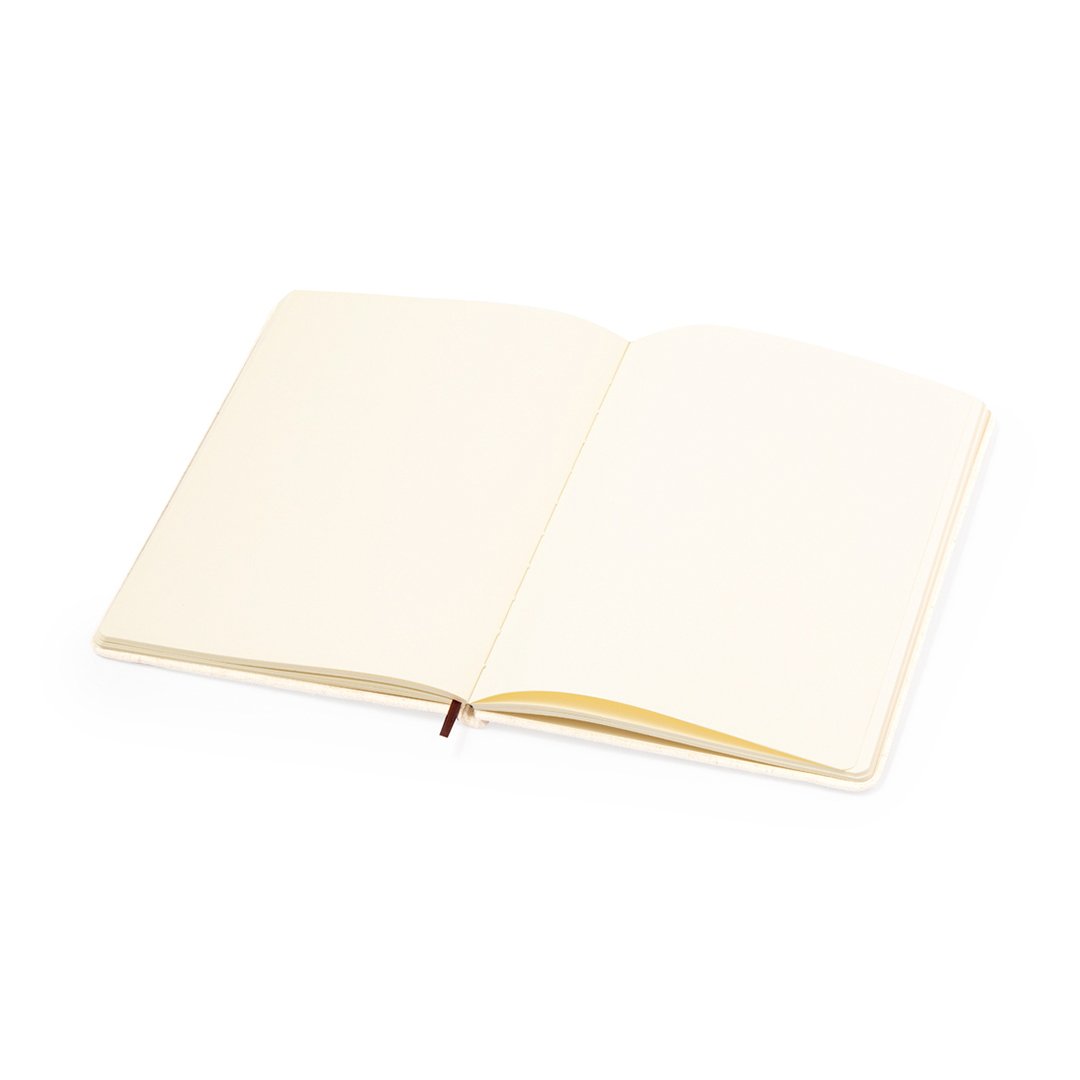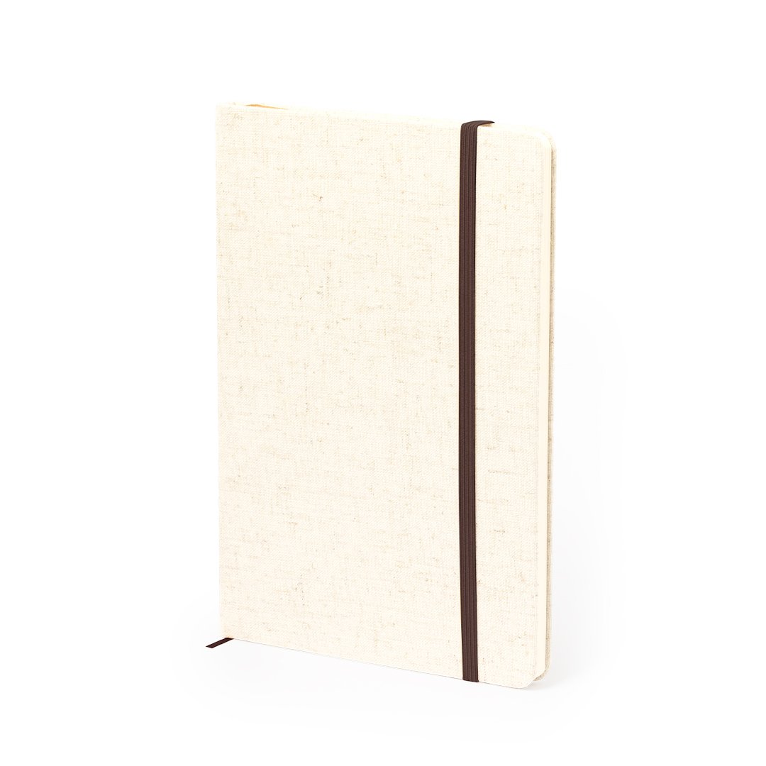 Bloc de notas confeccionado en suave lino. De tapas rígidas, marcapáginas, banda elástica de color marrón y 80 hojas lisas color natural. Con logotipo Lino en contraportada. Presentado en bolsa individual. Elaborado con elementos vegetales para así fomentar la utilización de materias primas naturales y reducir las emisiones contaminantes.