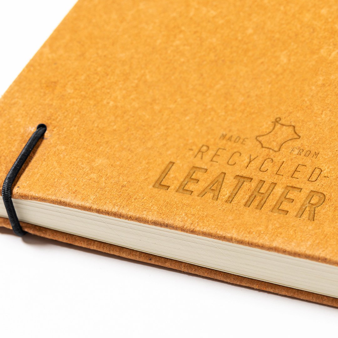Bloc de notas de línea nature. Con tapas rígidas fabricadas en cuero reciclado, que rescata las fibras desechadas en los procesos de fabricación, minimizando el desperdicio de material, contribuyendo a reducir el impacto ambiental y manteniendo a la vez sus propiedades originales. Interior con 100 hojas de disposición a una raya. Incluye marcapáginas, elástico de cierre y soporte para bolígrafo a juego. Incluye distintivo cuero reciclado.