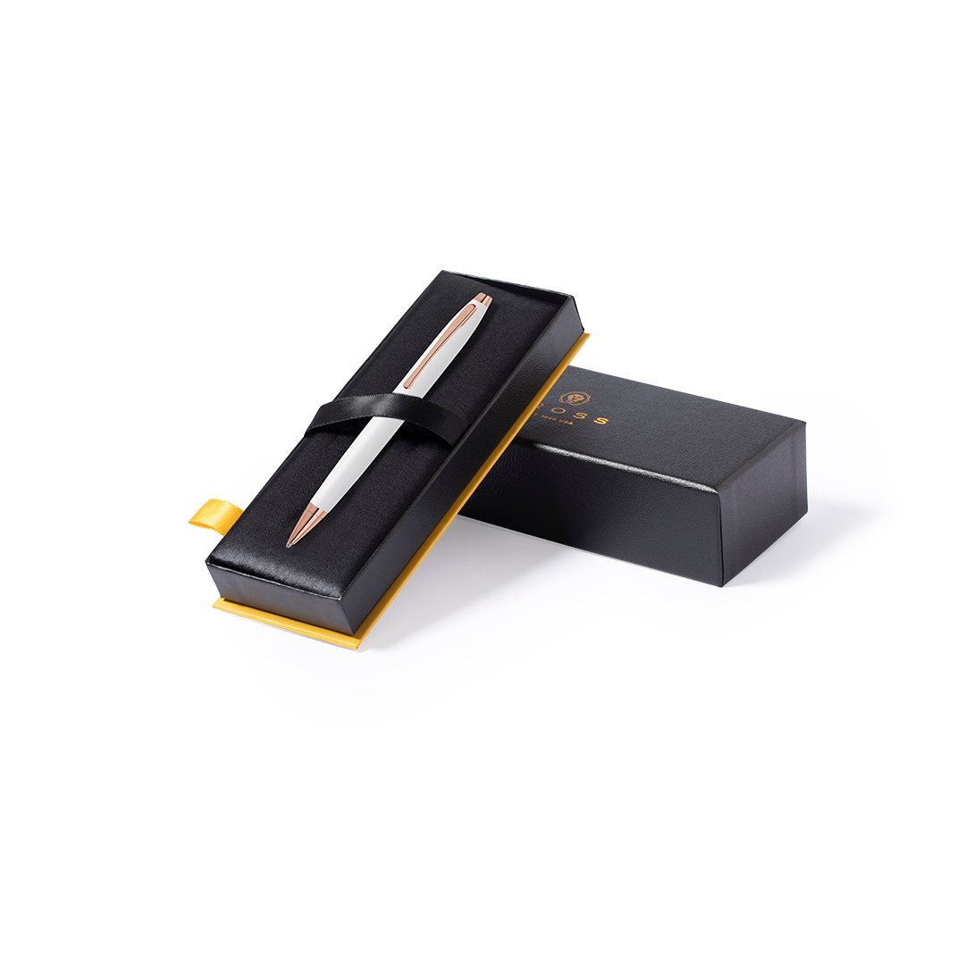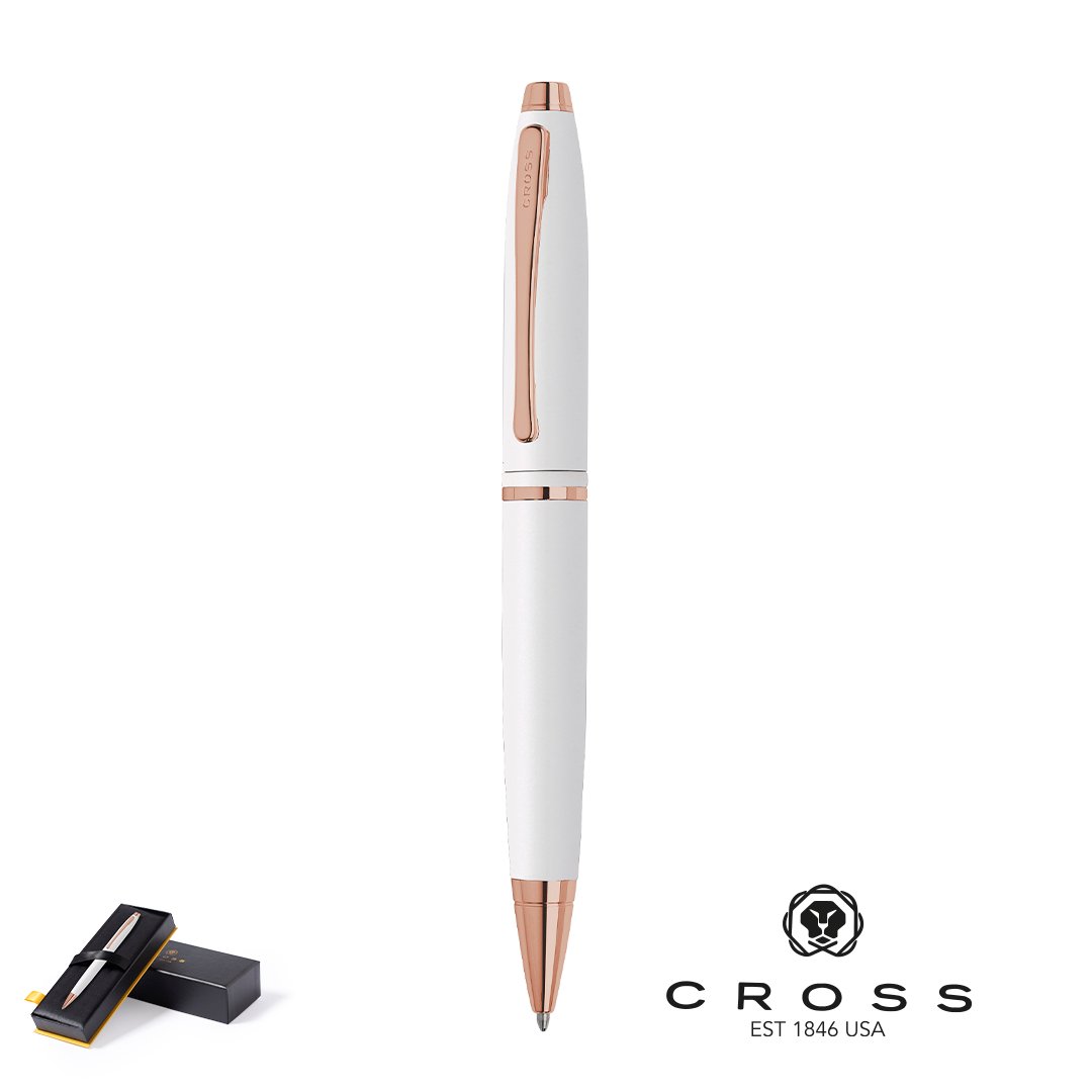 Bolígrafo Cross con mecanismo retráctil, de distinguido diseño bicolor blanco con elegantes toques de oro rosa. Cuerpo metálico en suave acabado y original clip con logotipo. Presentado en elegante estuche individual en color negro, con logotipo de la marca e interior en suave antelina a juego. En tinta negra.