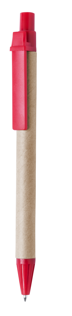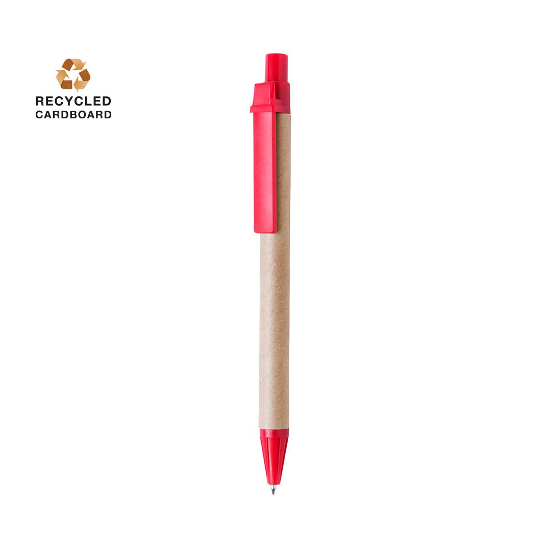 Bolígrafo de mecanismo pulsador en original combinación de cuerpo en cartón reciclado de color natural y accesorios en vivos colores. Tinta negra.