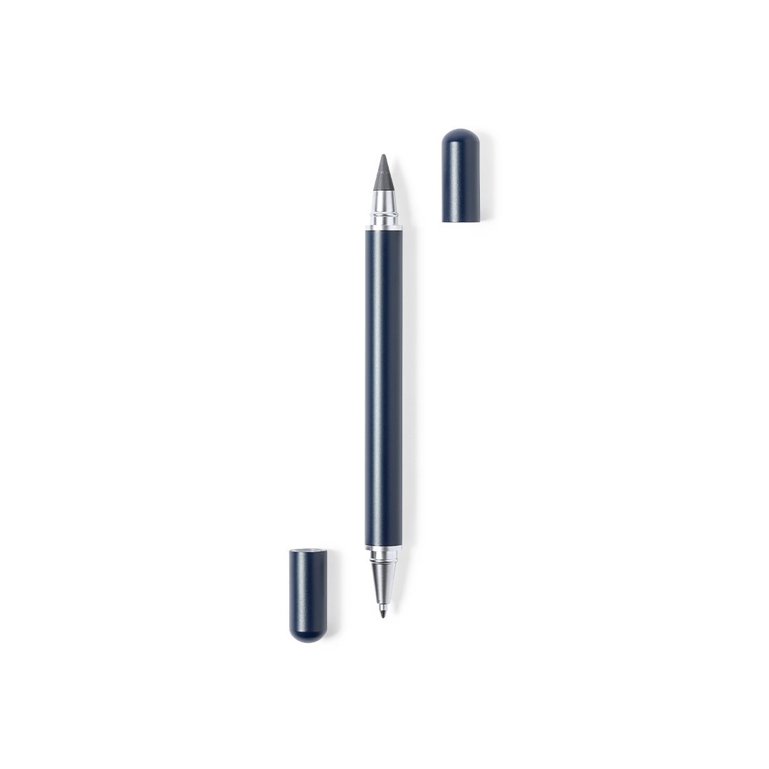 Bolígrafo lápiz eterno 2 en 1, fabricado en resistente metal de acabado brillo. Con cierre de capucha, incluye bolígrafo en un extremo (carga jumbo y tinta azul), y lápiz eterno en el otro extremo, para así usar siempre el mismo lápiz y no generar residuos. Presentado en estuche individual negro.