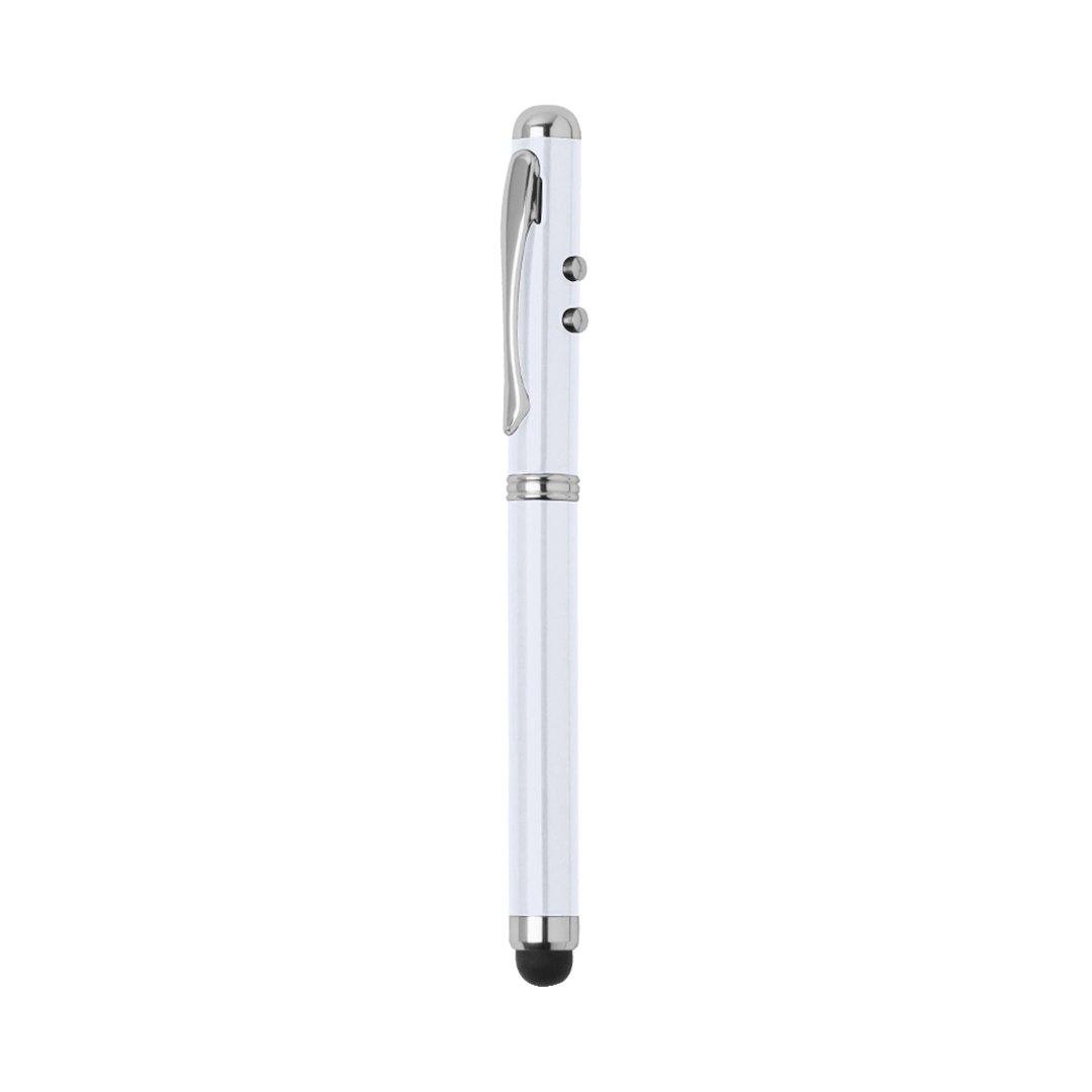 Bolígrafo láser metálico en elegante acabado brillo, con pulsadores de activación laterales para funciones láser y linterna (pilas de botón incluidas). En tinta azul, con puntero táctil integrado, cierre de capucha y clip cromado. Especialmente diseñado para marcaje en láser. Presentado en un elegante estuche metálico en caja individual de cartón de acabado plateado. Interior en suave esponja troquelada, con pilas de recambio.