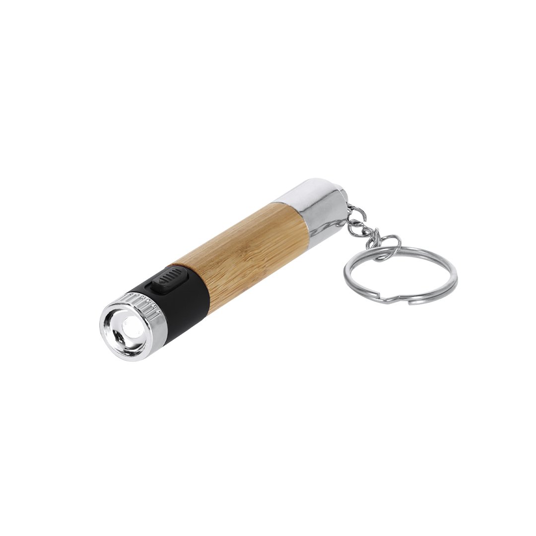 Boligrafo con linterna led integrada. De original diseño, con cuerpo en bambú y capucha con anilla metálica cromada. En tinta azul y con pilas de botón incluidas.