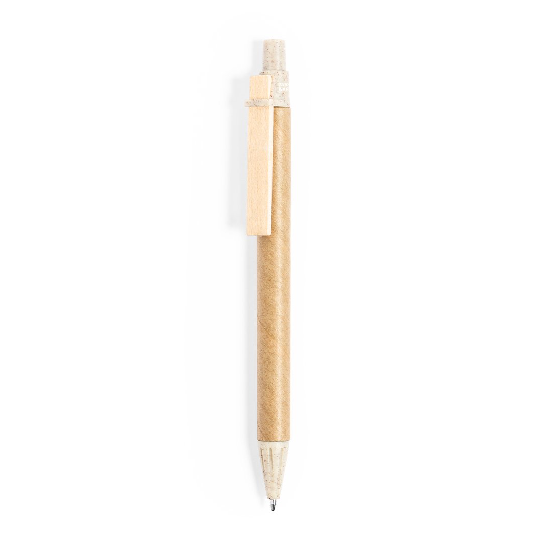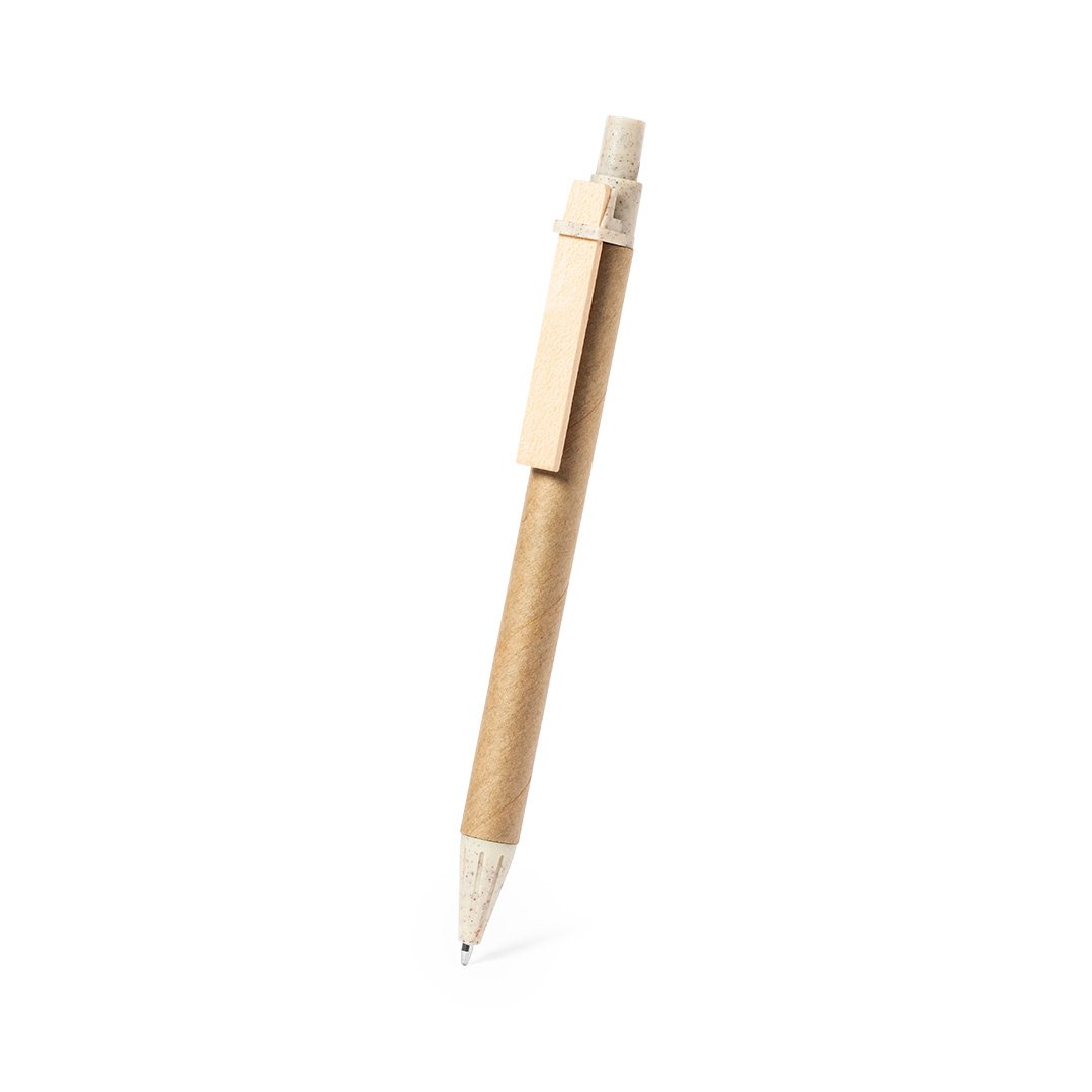 Bolígrafo de línea nature con mecanismo pulsador. Combinación de cuerpo en cartón reciclado de color natural, con punta y pulsador en caña de trigo y clip de madera, para así fomentar la utilización y reciclado de materias primas, reduciendo así las emisiones contaminantes. Tinta azul. Con distintivo Wheat Straw en la parte superior.