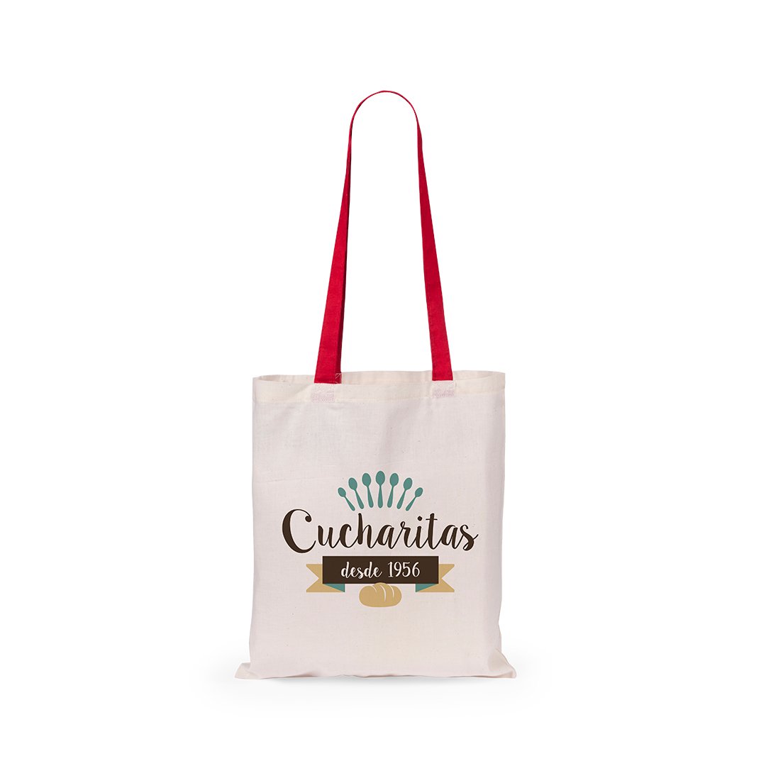 Bolsa en material 100% algodón en combinación de cuerpo en color natural y asas en variada gama de vivos colores. Con asas largas de 70cm y acabado cosido. Resistencia hasta 7kg de peso.