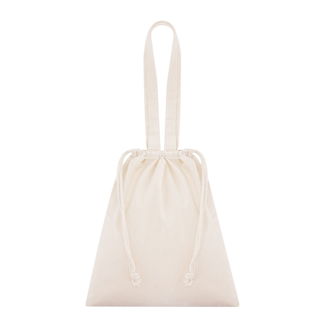 Bolsa con cuerdas ajustables fabricada en algodón 180g/m2 Con asas largas de 70 x 2.5 cm reforzadas. Resistencia máxima de 7 kg.