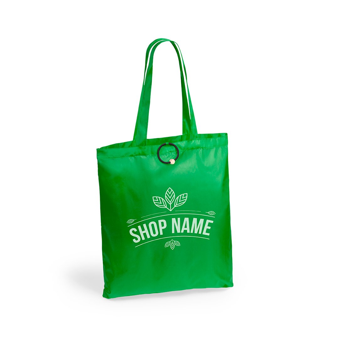 Bolsa plegable en divertidos y variados colores. De suave poliéster 190T, con elástico para plegado y de acabado cosido.