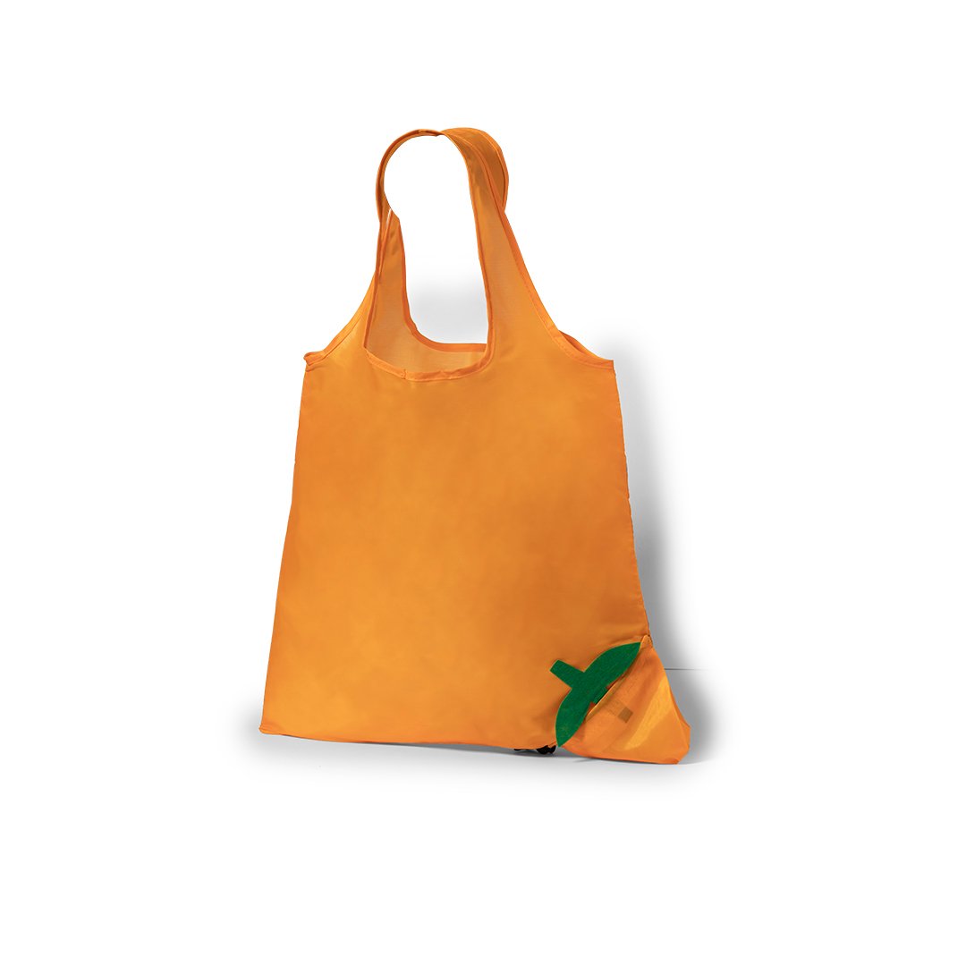 Bolsa plegable de divertidos diseños de frutas en llamativos colores. De suave poliéster 190T, con cordón y accesorio de ajuste.