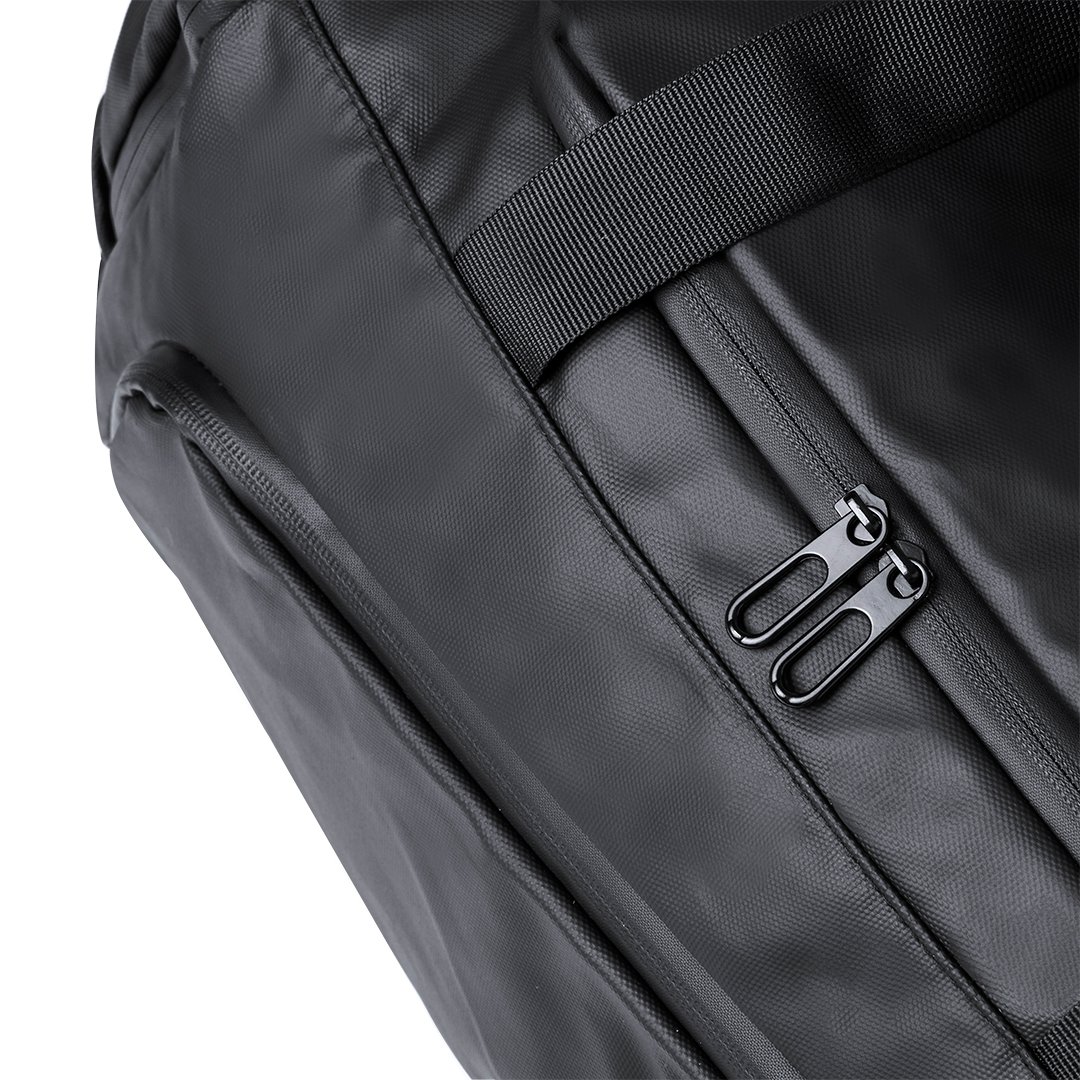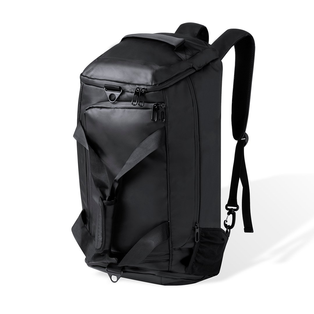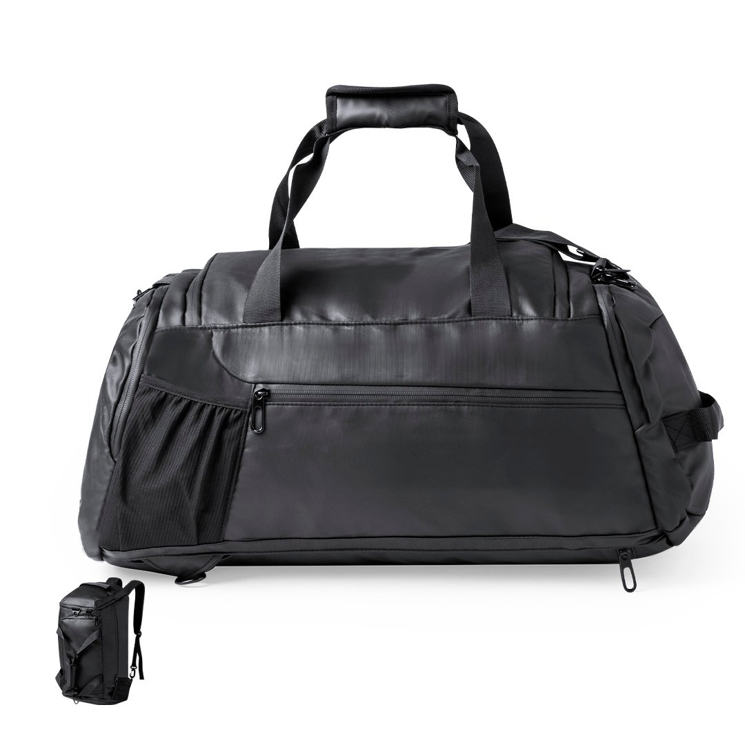 Bolso mochila confeccionado en resistente y suave polipiel. Su compartimento central se cierra mediante cremallera de doble tirador. Además, presenta un bolsillo lateral independiente y uno más en el otro extremo, ambos con cierre de cremallera; y en la base uno especialmente diseñado para zapatos. También incluye bolsillo exterior de rejilla. Ofrece tres opciones de transporte: como mochila, gracias a las asas acolchadas y plegables; como bolso de mano; o bien como bandolera gracias a su cinta para el hombro ajustable. Las cremalleras están discretamente ocultas para un diseño más elegante. Presentado en bolsa individual.