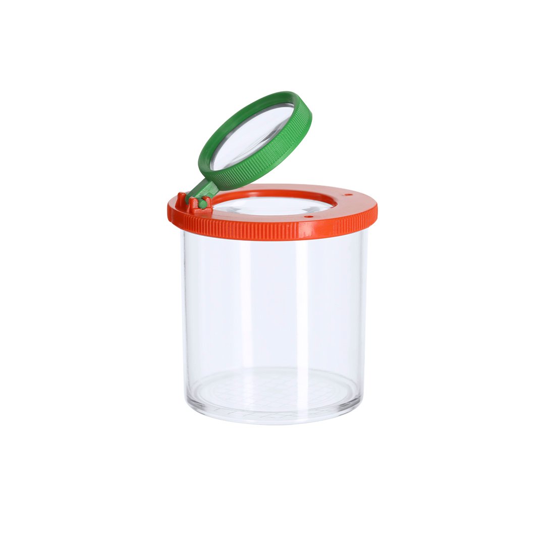 Bote lupa fabricado en resistente ABS. Con lente de aumento de 3X y lente abatible adicional de 6X en tapadera. Incluye cuadrícula escalada de 0,5×0,5cm en el fondo para mediciones precisas.