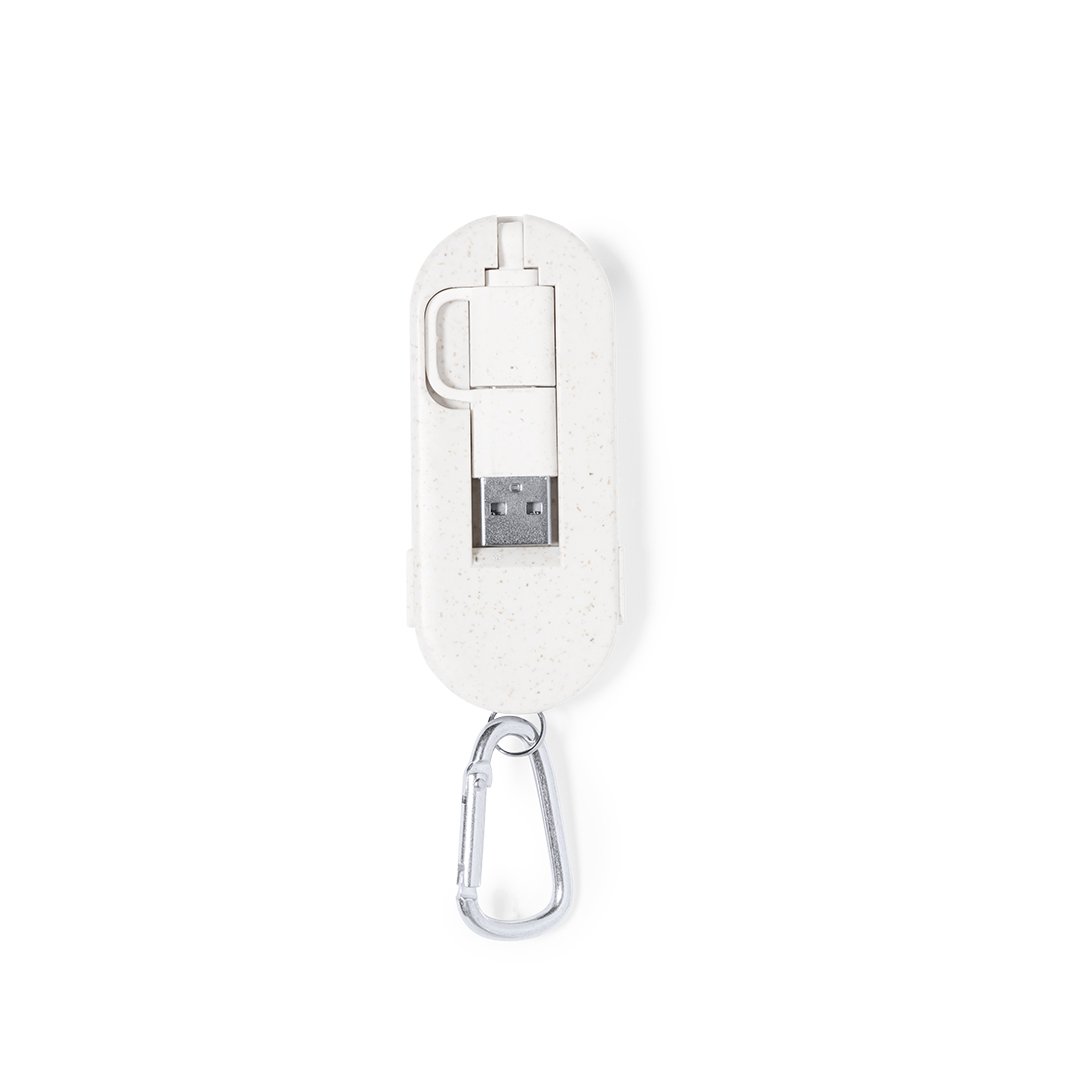 Cable cargador con mosquetón fabricado en fibra de trigo y bambú. Con conexiones de entrada Tipo C y USB y salidas Tipo C, lightning y Micro USB. 5V DC 2A. Presentado en bolsa individual de diseño kraft.Elaborado con elementos vegetales para así fomentar la utilización de materias primas naturales y reducir las emisiones contaminantes.