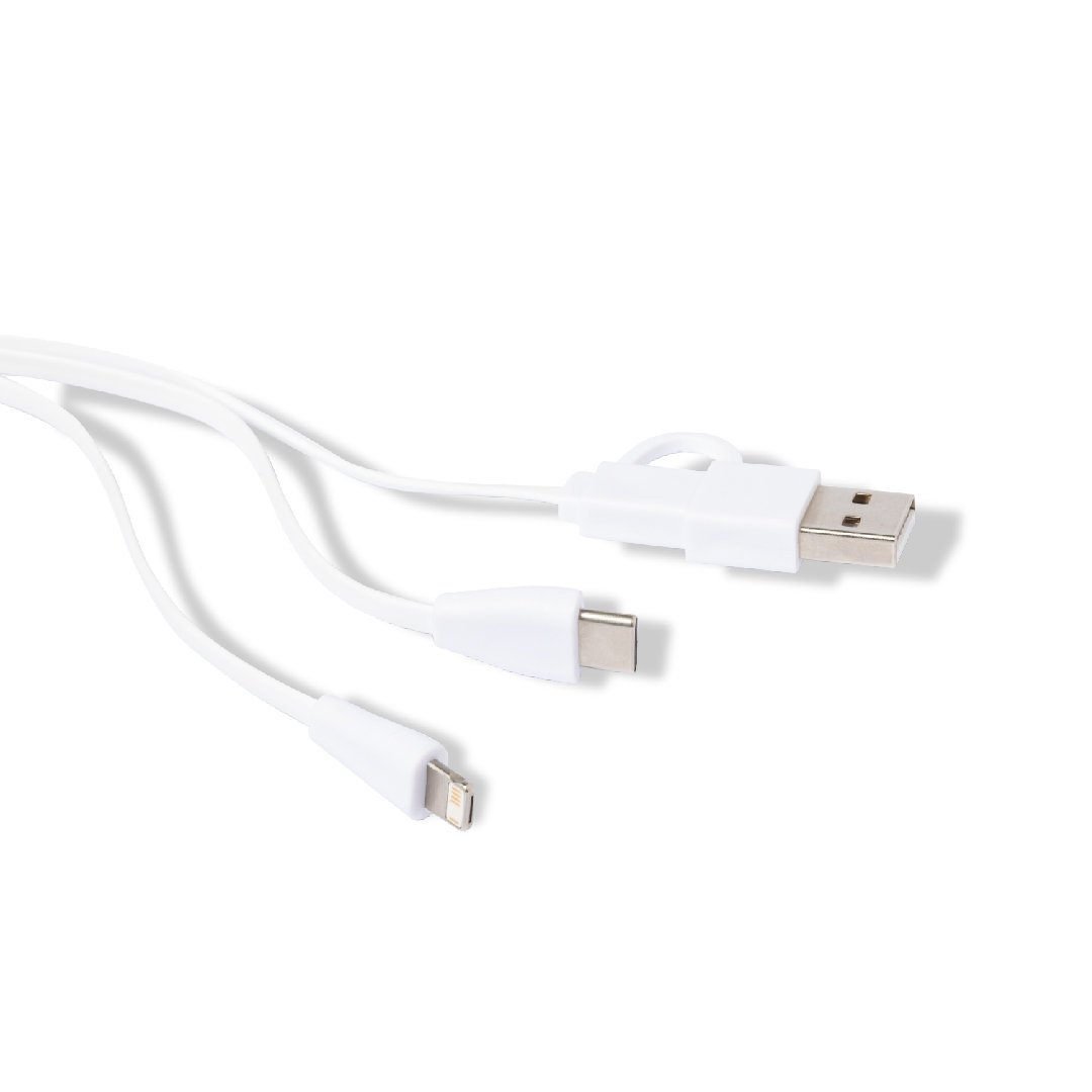 Cable cargador con llavero, fabricado en bambú y con detalle en extracto de mármol. Incluye conexiones de entrada USB y Tipo C, con salidas Lightning, Micro USB y Tipo C 5VDC 2.4A. Presentado en bolsa individual de diseño kraft.
