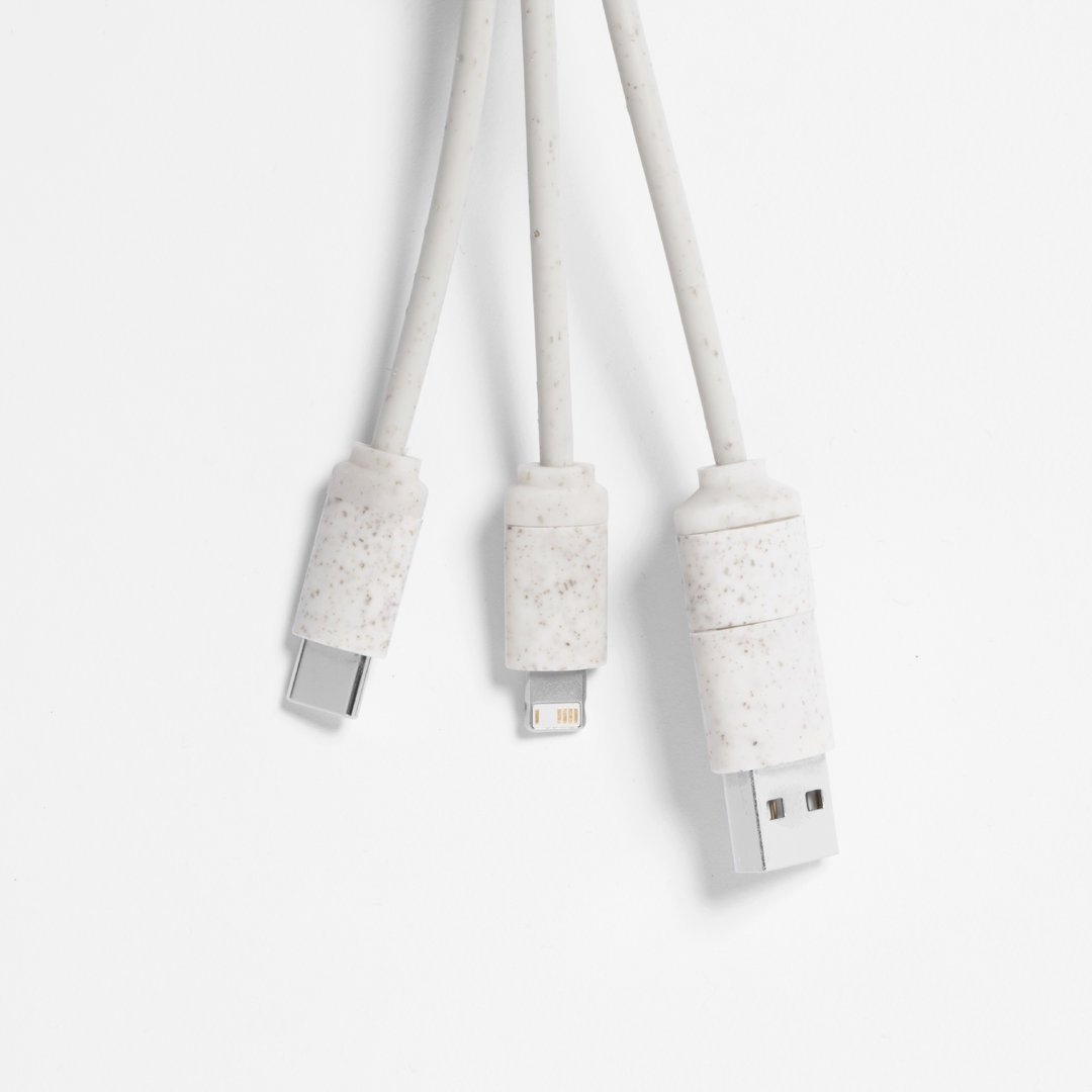 Cable cargador con anilla fabricado en caña de trigo, para así fomentar la utilización de materias primas naturales y reducir las emisiones contaminantes. Incluye conexiones de entrada Tipo C y USB salidas Lightning, Micro USB y USB. Presentado en bolsa individual de diseño kraft.