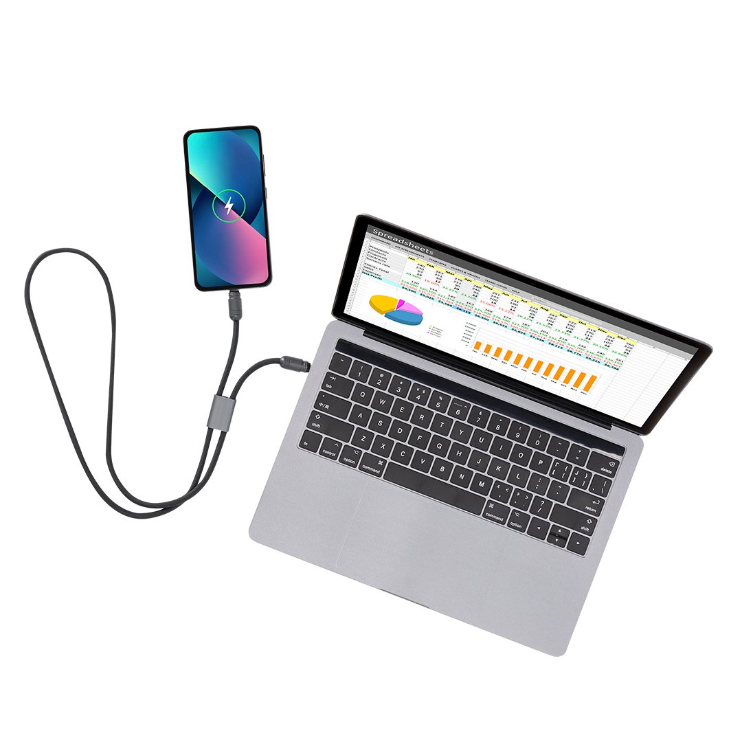 Pulsera cable de carga con función de transferencia de datos y soporte para móvil. Con entrada/salida Tipo C y capacidad de 60W , lo que permite una carga rápida. Funcionalidad y comodidad en un solo accesorio.
