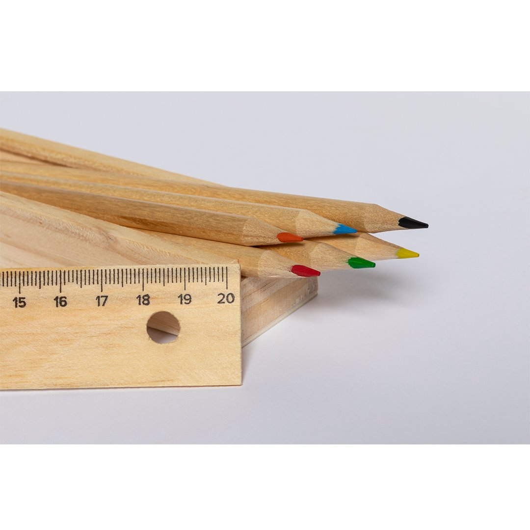 Set de 6 lápices en estuche de madera natural. Lápices en madera, con cuerpo redondo de acabado natural y minas en colores variada gama de vivos colores. Tapa de cierre anti deslizante con regla integrada de 20cm.