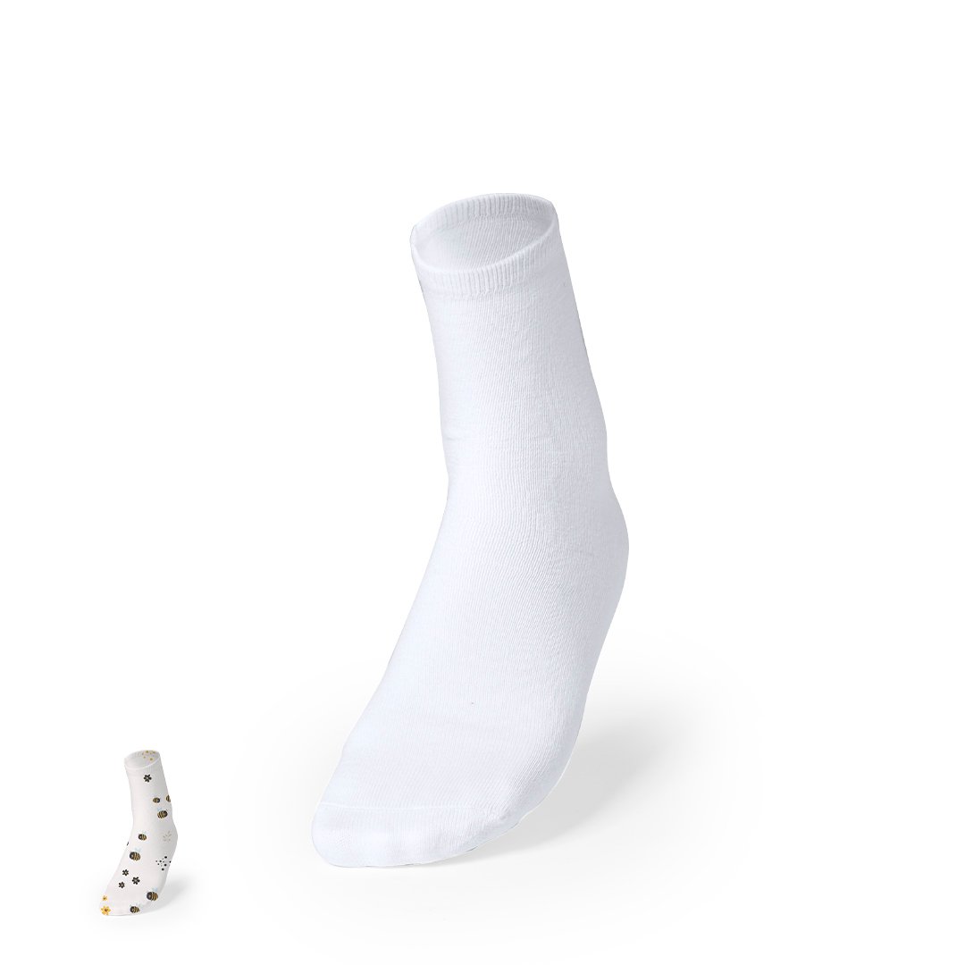 Par de calcetines fabricados en poliéster blanco y especialmente diseñados para marcaje en sublimación. En talla L-XL.