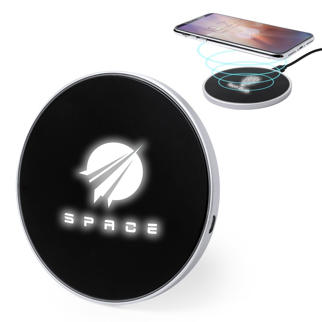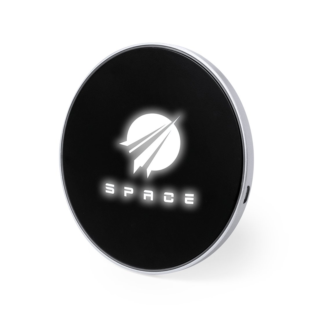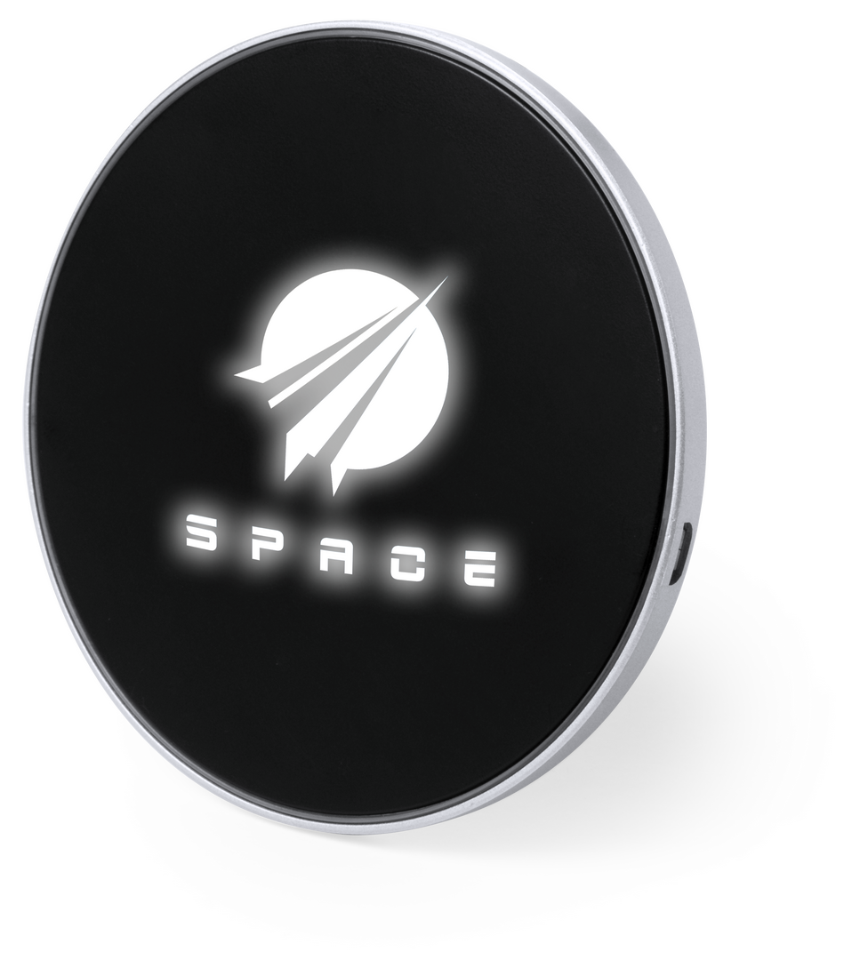 Cargador inalámbrico circular. En elegante color negro, con luz led interior y un recubrimiento exterior especialmente diseñado para marcaje en láser, con el que conseguirá que su publicidad o marca quede iluminada con luz blanca. Base antideslizante y compatible con dispositivos equipados con tecnología de carga inalámbrica. Presentado en atractiva caja de diseño. Cable USB incluido.