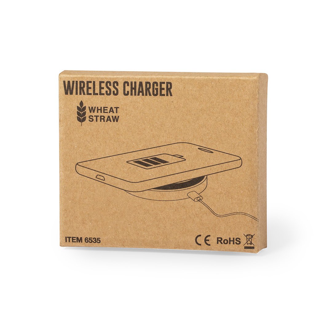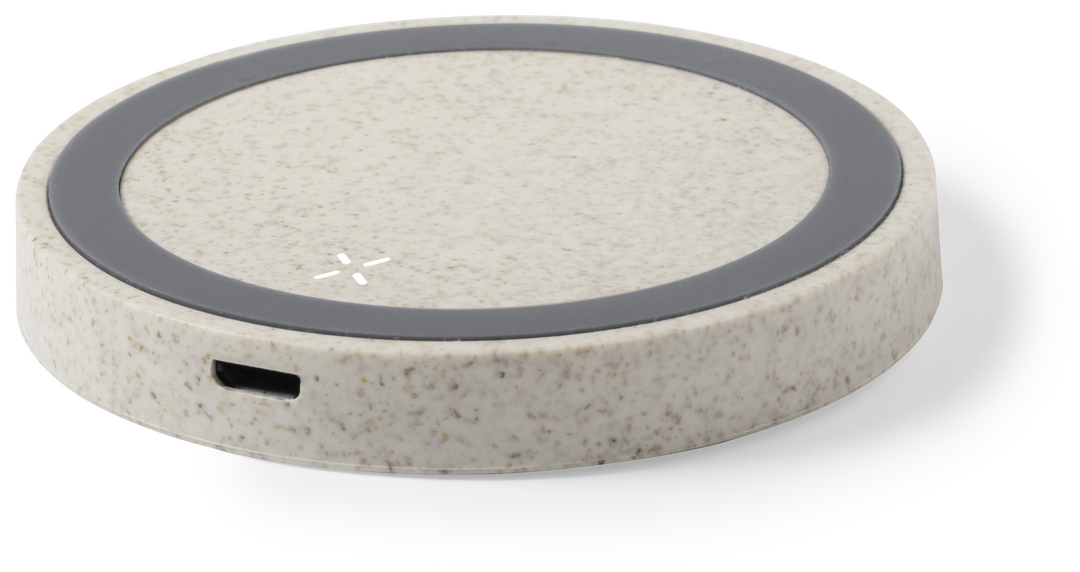 Cargador inalámbrico circular de línea nature. Carcasa en caña de trigo, para así fomentar la utilización de materias primas naturales y reducir las emisiones contaminantes. Con base antideslizante e indicador LED de estado de carga. Compatible con smartphones con tecnología de carga inalámbrica y presentado en atractiva caja de diseño eco.