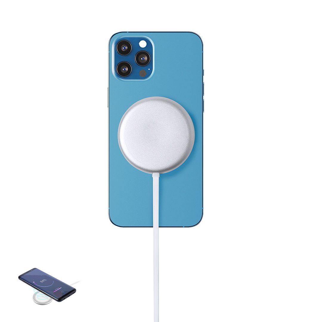Cargador inalámbrico magnético 10W. Carcasa fabricada en resistente aluminio de acabado plateado. Con indicador de estado de carga y cable USB de 1m con conector de aluminio. Incluye accesorio metálico con adhesivo 3M, de fijación extra fuerte y libre de residuo al despegarlo del dispositivo, permitiendo así el uso de la función magnética del cargador en cualquier dispositivo móvil. Compatible con terminales equipados con tecnología de carga inalámbrica. Amplia superficie de marcaje y presentado en atractiva caja de diseño. Disponible manual de instrucciones en español e inglés.