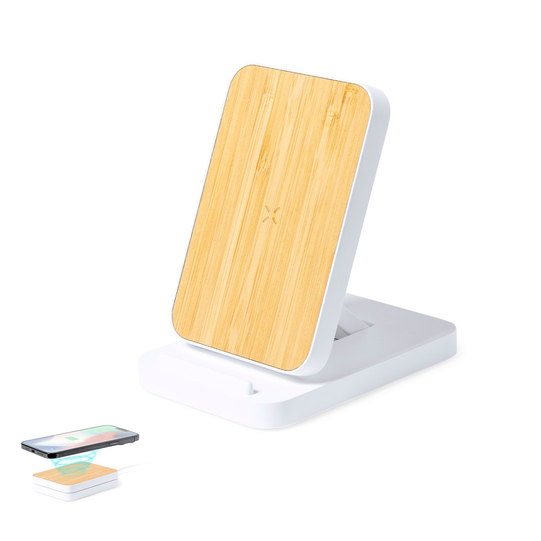 Cargador inalámbrico plegable 15W. Con base fabricada en resistente ABS de color blanco y superficie de carga en bambú, con soporte telescópico integrado. Compatible con dispositivos equipados con tecnología de carga inalámbrica Qi, con cable de carga Tipo C incluido. Presentado en caja individual de diseño kraft, con manual de instrucciones en español e inglés. Fabricado conforme a los estándares RoHS y en cumplimiento con los siguientes requisitos de seguridad: Sistema de protección contra sobrecalentamiento. Sistema de protección contra sobrecarga. Sistema de bloqueo para evitar cortocircuitos.