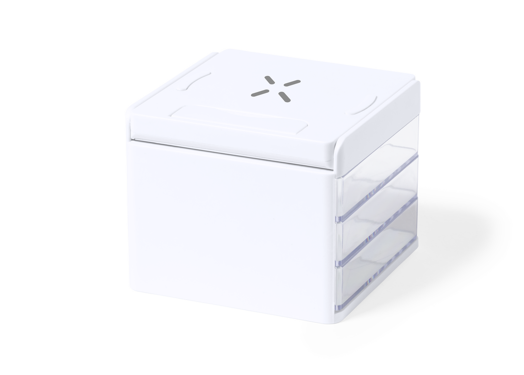 Cargador organizador con soporte para smartphone y cargador inalámbrico 10W integrado, compatible con dispositivos equipados con tecnología de carga inalámbrica Qi. Con 3 compartimentos de almacenaje transparentes y extraíbles. Indicador de estado de carga, con cable de carga Tipo C de 1 m incluido. Base antideslizante y presentado en caja individual de diseño kraft, con manual de instrucciones en español e inglés.Fabricado conforme a los estándares RoHS y en cumplimiento con los siguientes requisitos de seguridad:Sistema de protección contra sobrecalentamiento.Sistema de protección contra sobrecarga.Sistema de bloqueo para evitar cortocircuitos.