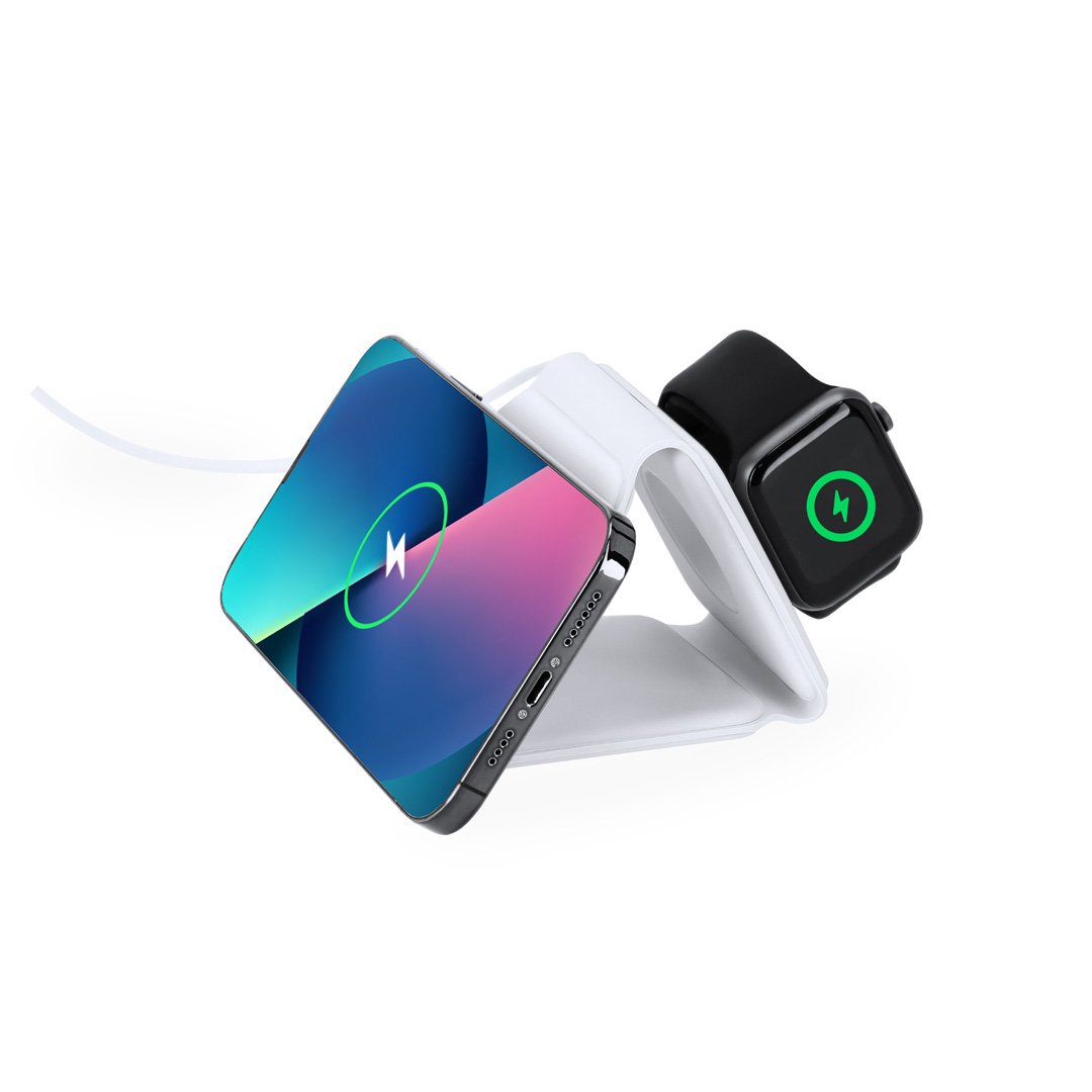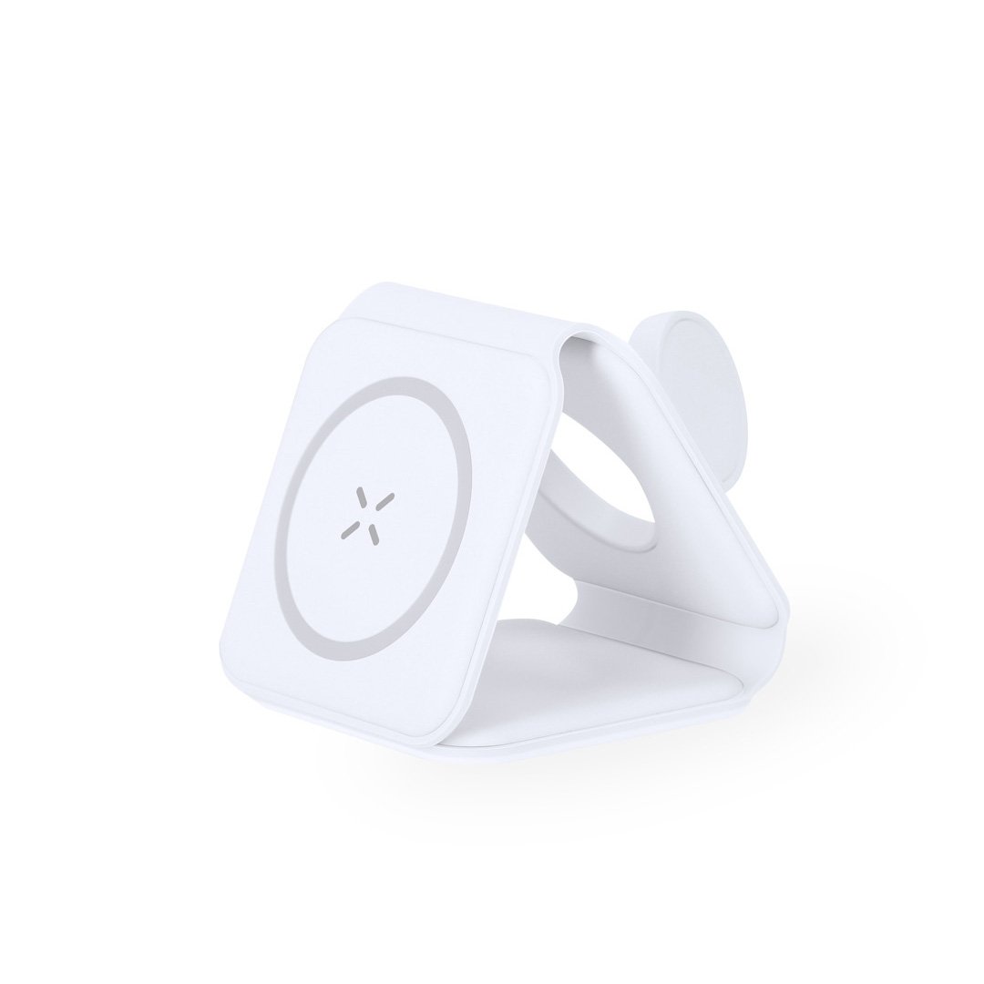 Completo cargador inalámbrico magnético 15W, diseñado para la carga simultánea del smartphone, auriculares y smartwatch. Un gadget todo en uno: plegable, portátil, de tamaño compacto, muy versátil y de diseño funcional. Conexión por usb Tipo C -cable incluido- y elaborado en resistente ABS de color blanco. Fabricado conforme a los estándares RoHS y en cumplimiento con los siguientes requisitos de seguridad:Sistema de protección contra sobrecalentamiento.Sistema de protección contra sobrecarga.Sistema de bloqueo para evitar cortocircuitos.