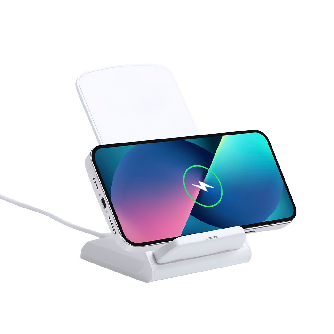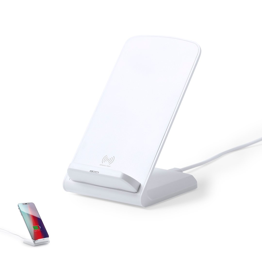 Cargador inalámbrico en elegante acabado blanco con función soporte para móvil. Función carga rápida de 10W y compatible con dispositivos equipados con tecnología de carga inalámbrica. Amplia superficie de marcaje y presentado en atractiva caja de diseño.