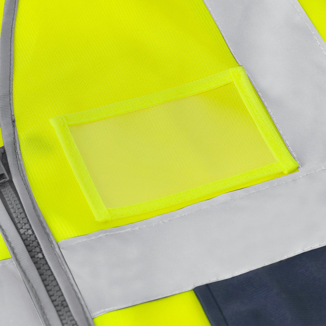 Chaleco de alta visibilidad con diseño bicolor. Incorpora dos bandas reflectantes horizontales en el cuerpo y dos adicionales en los hombros, mejorando la visibilidad en condiciones de baja luminosidad.Cuenta con cierre frontal de cremallera y varios bolsillos funcionales:- Dos bolsillos frontales laterales (16 x 18,5 cm)- Bolsillo superior derecho con cierre de velcro (6,5 x 15 cm)- Compartimento para tarjeta identificativa (10,5 x 8 cm)-Anilla plástica en el bolsillo superior, ideal para enganchar llaves o accesorios