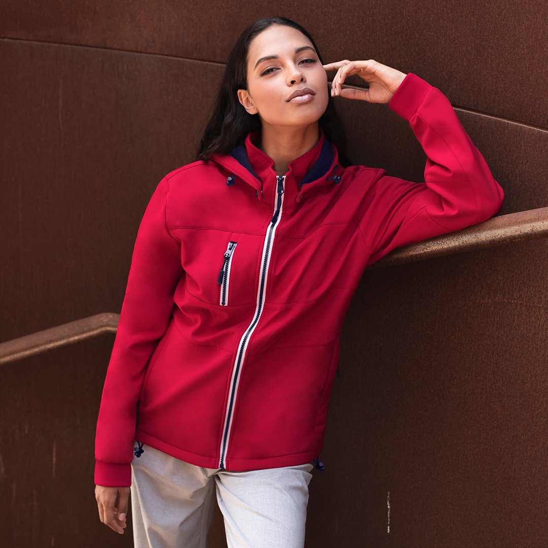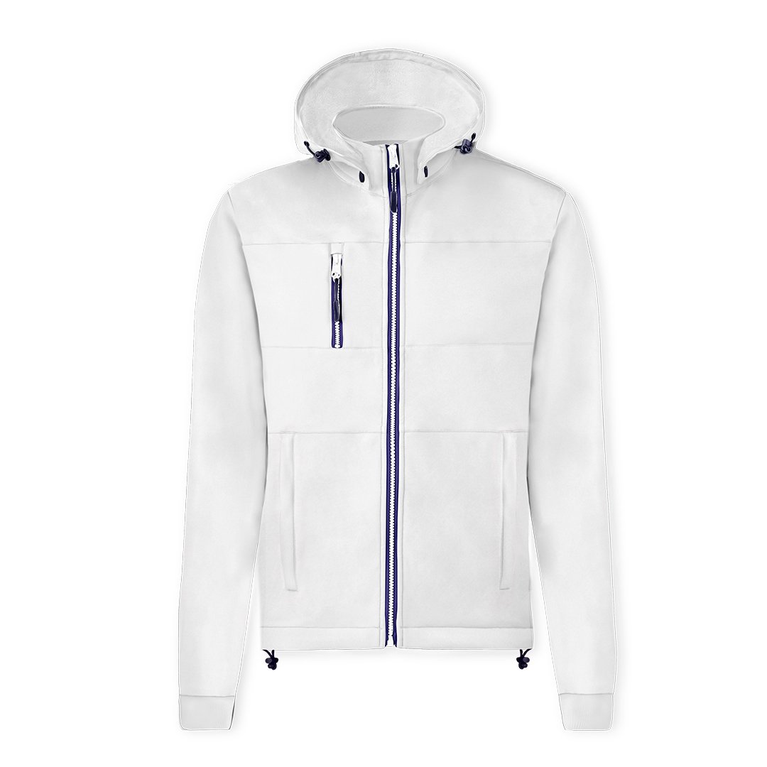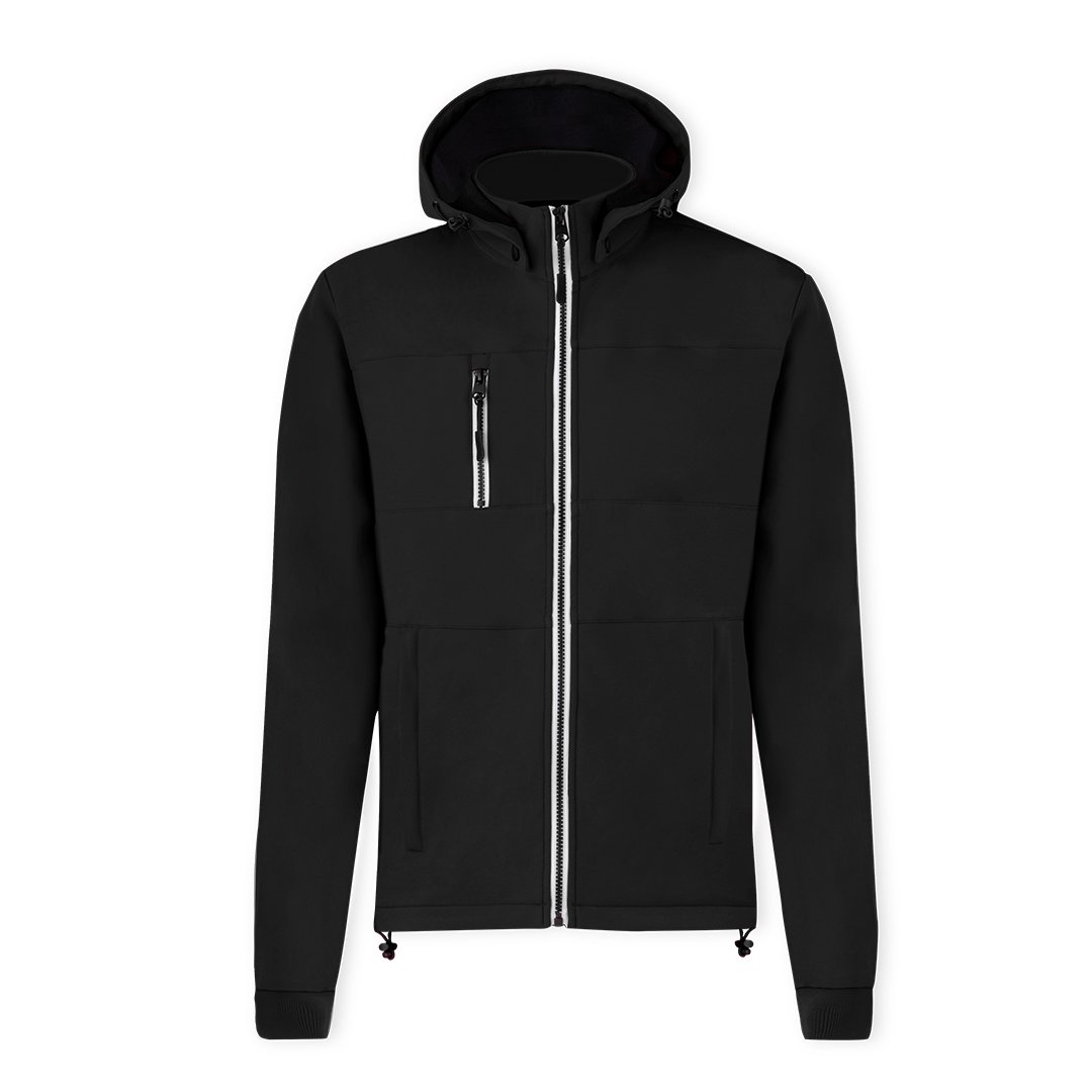 Chaqueta de resistente y transpirable material soft shell de 300g/m2. De corte moderno, con cremallera central, bolsillos laterales y práctico bolsillo en pecho con cierres de cremallera y tiradores en contraste. Cuello elevado con capucha ajustable y desmontable. Dobladillo inferior con cordón ajustable. Mangas con cómodos puños de punto en color a juego. Exterior en soft shell resistente al viento y al agua, e interior de cálido micropolar en color contraste. Disponible en tallas XS, S, M, L, XL, XXL.