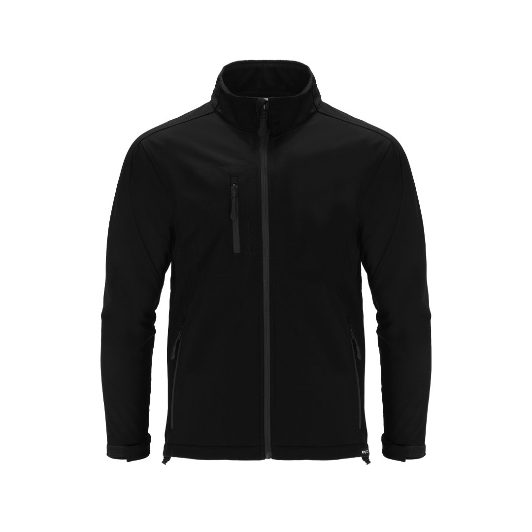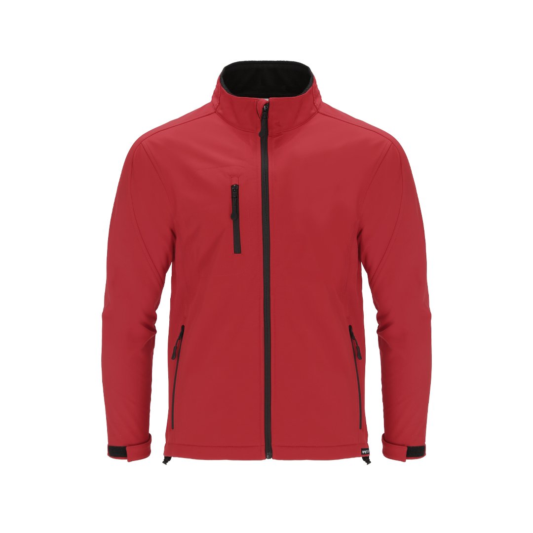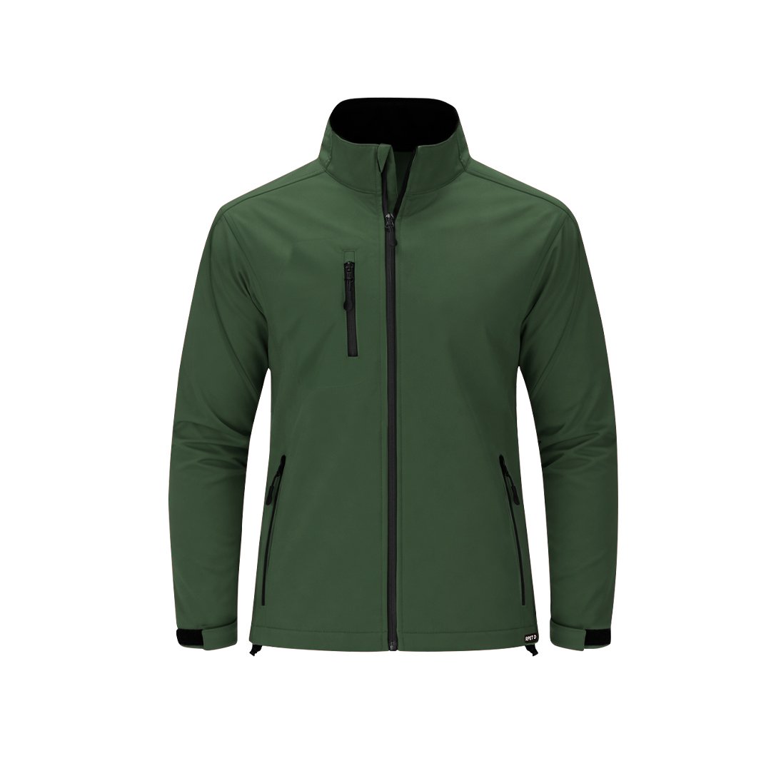 Chaqueta Soft Shell RPET confeccionada en 3 capas, de 340 g/m2. Con membrana de 8000mm, impermeable y transpirable. Exterior en Soft Shell e interior en tejido polar microfleece en color negro. Con bolsillo exterior en pecho derecho y dos bolsillos laterales con cremalleras. Con cremallera central y cremalleras invertidas en bolsillos, incluyendo tiradores de cordón en color negro. Mangas ranglán con sistema de ajuste de velcro en el puño en color negro. Cuenta con protector de barbilla a juego y cintura ajustable, con cordón elástico y tope. Distintivo RPET en el ribete de la prenda.
