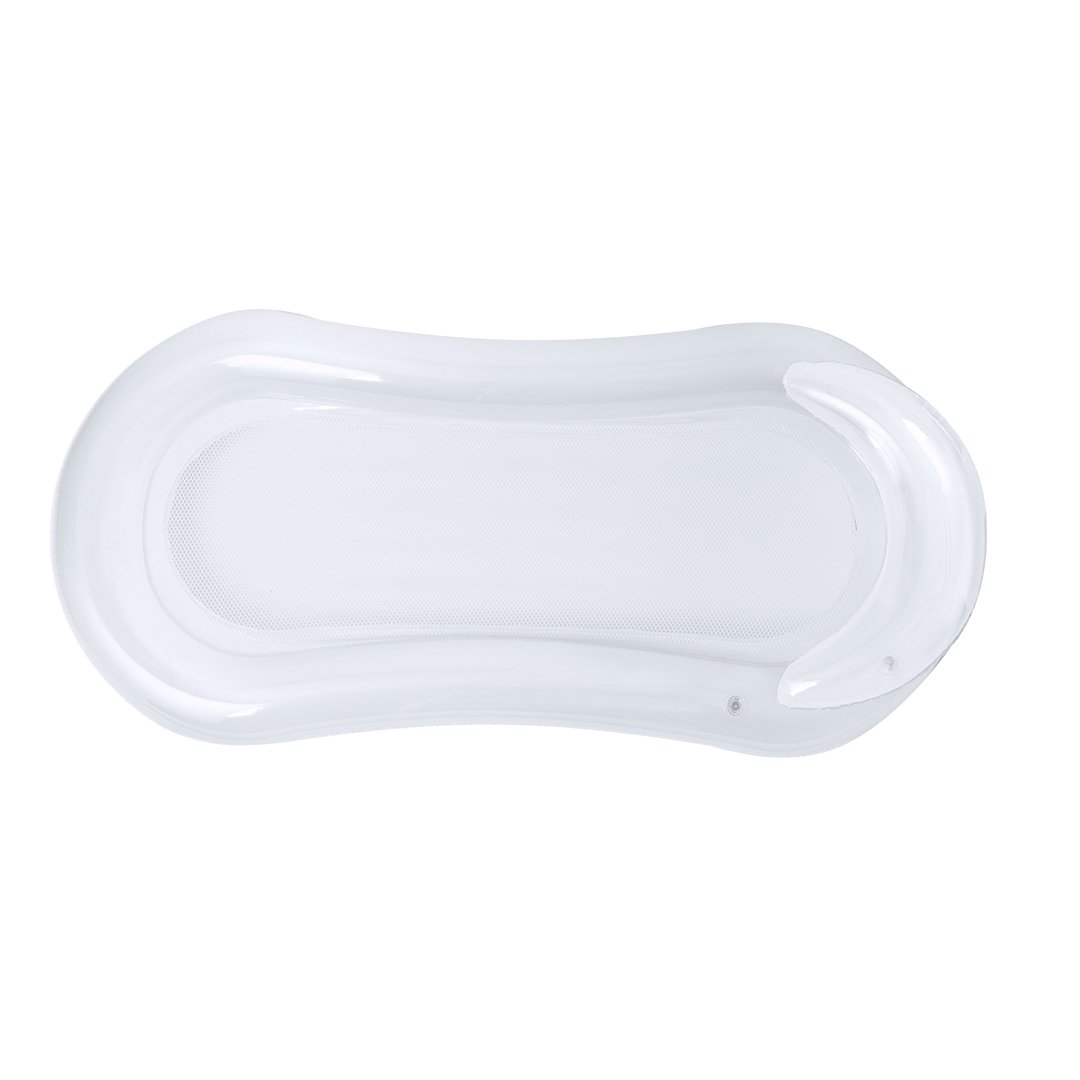 Original colchoneta en resistente PVC. Incluye una cómoda almohada para la cabeza, con diseño bitono, en colores transparente y blanco. Incluye una resistente redecilla central en poliéster de color blanco. Con plegado especial para fácil impresión. Se sirve desinflada y en una práctica bolsa individual reciclada.