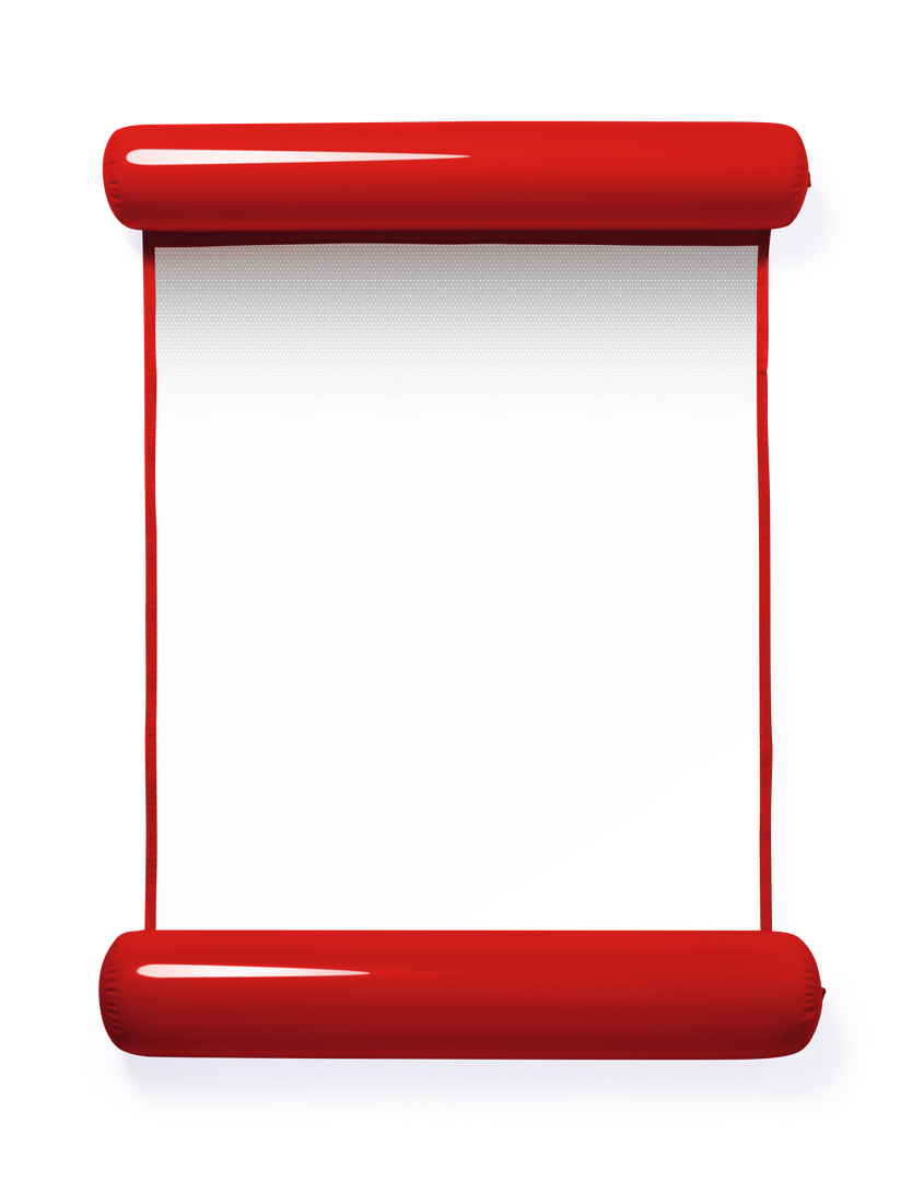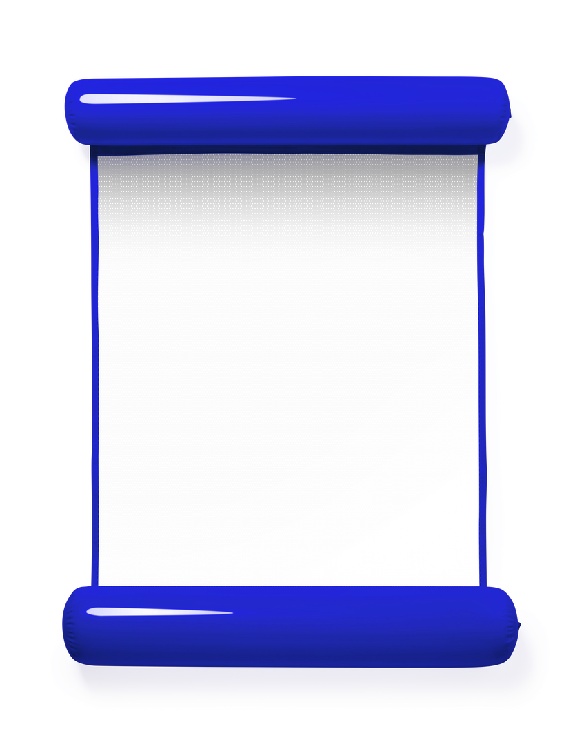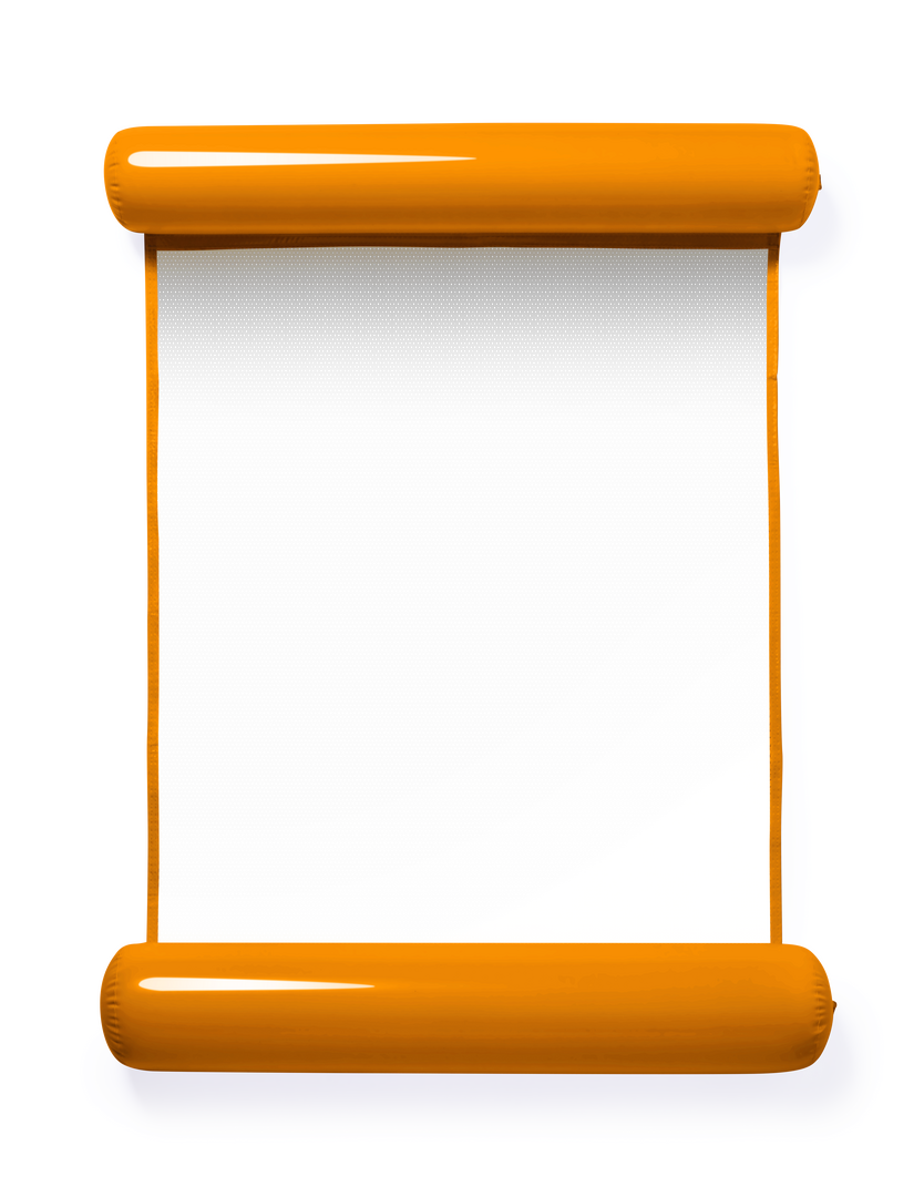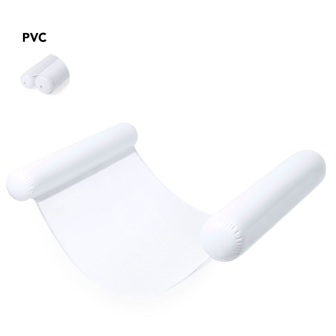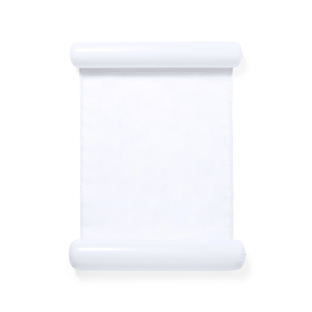 Original colchoneta con extremos hinchables en resistente PVC. Enrollable y con resistente redecilla central de 80×70 cm en poliéster de color blanco. Con plegado especial para fácil impresión y disponible en variada gama de colores.