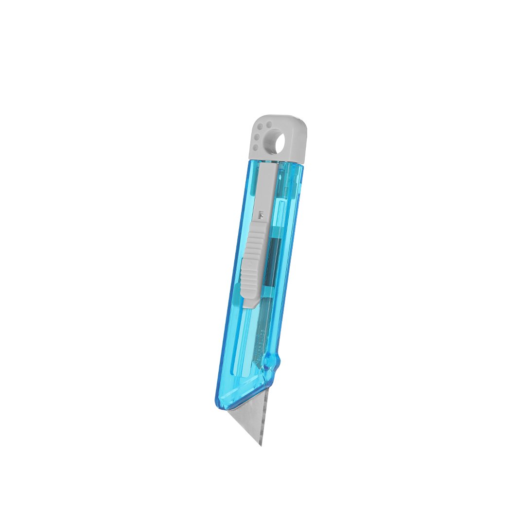 Cúter en PS de acabado translúcido. Con un mecanismo pulsador de retracción automática y una hoja de acero de 6 x 1,9 cm, sin sistema de bloqueo (stopper).