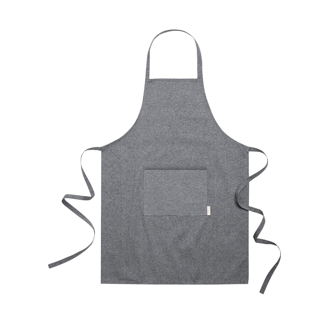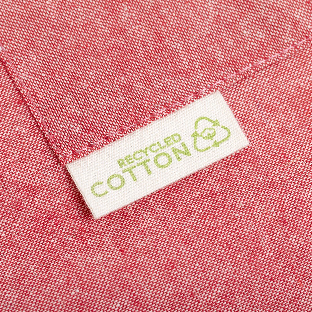 Delantal de línea nature, elaborado en algodón reciclado. Con bolsillo frontal y cintas de ajuste, de corte por debajo de la rodilla. Disponible en variada gama de colores, con distintivo algodón reciclado en etiqueta.