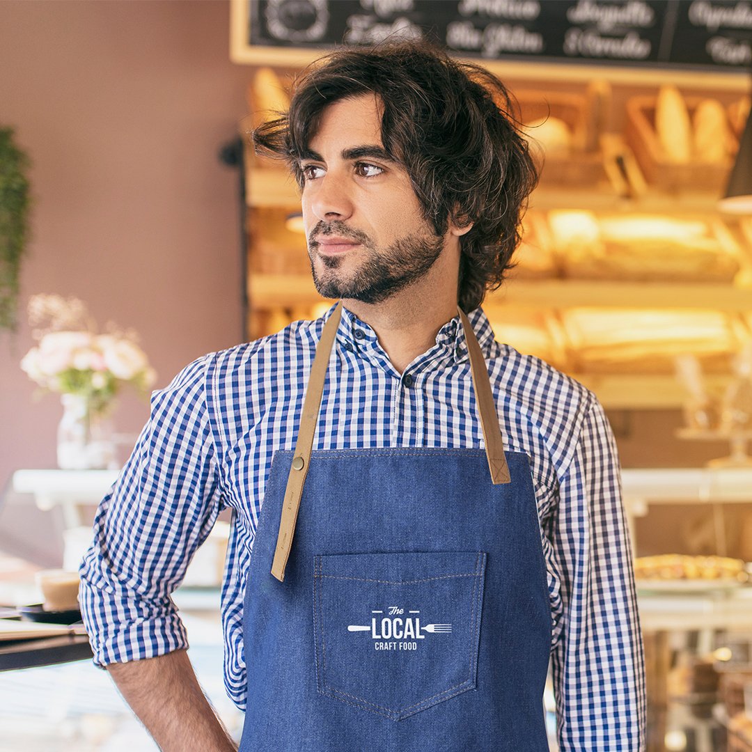 Delantal de alta calidad en resistente tela de acabado denim. De corte por debajo de la rodilla, con cinta de cuello ajustable por botón, cintas para la cintura en color marrón, reforzadas. Incluye multitud de bolsillos para llevar cómodamente los distintos utensilios, con costuras reforzadas y remaches metálicos.